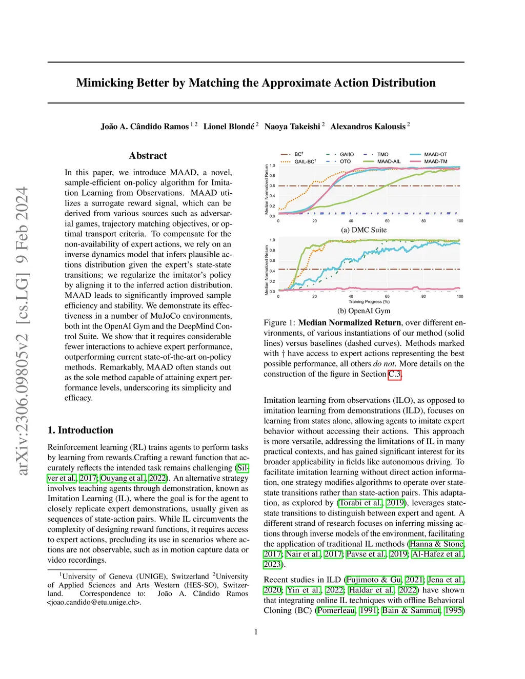 In this paper, we introduce MAAD, a novel, sample-efficient on-policy algorithm for Imitation Learning from Observations. MAAD utilizes a surrogate reward signal, which can be derived from various sources such as adversarial games, trajectory matching objectives, or optimal transport criteria. To compensate for the non-availability of expert actions, we rely on an inverse dynamics model that infers plausible actions distribution given the expert's state-state transitions; we regularize the imitator's policy by aligning it to the inferred action distribution. MAAD leads to significantly improved sample efficiency and stability. We demonstrate its effectiveness in a number of MuJoCo environments, both int the OpenAI Gym and the DeepMind Control Suite. We show that it requires considerable fewer interactions to achieve expert performance, outperforming current state-of-the-art on-policy methods. Remarkably, MAAD often stands out as the sole method capable of attaining expert performance levels, underscoring its simplicity and efficacy.