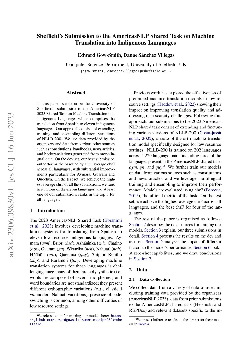 In this paper we describe the University of Sheffield's submission to the AmericasNLP 2023 Shared Task on Machine Translation into Indigenous Languages which comprises the translation from Spanish to eleven indigenous languages. Our approach consists of extending, training, and ensembling different variations of NLLB-200. We use data provided by the organizers and data from various other sources such as constitutions, handbooks, news articles, and backtranslations generated from monolingual data. On the dev set, our best submission outperforms the baseline by 11% average chrF across all languages, with substantial improvements particularly for Aymara, Guarani and Quechua. On the test set, we achieve the highest average chrF of all the submissions, we rank first in four of the eleven languages, and at least one of our submissions ranks in the top 3 for all languages.