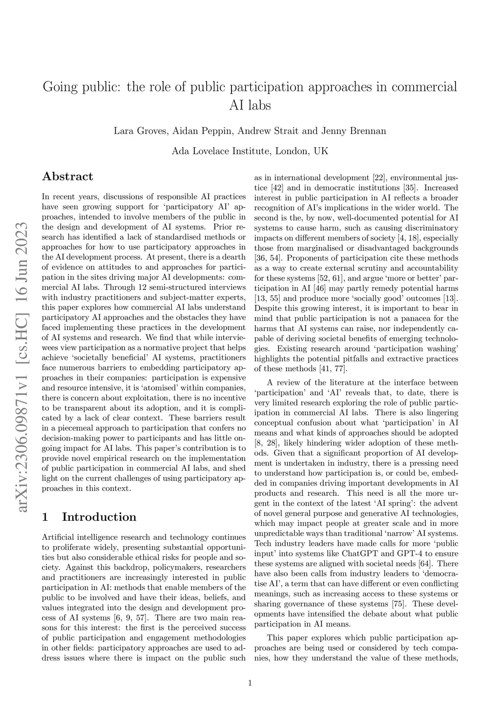In recent years, discussions of responsible AI practices have seen growing support for "participatory AI" approaches, intended to involve members of the public in the design and development of AI systems. Prior research has identified a lack of standardised methods or approaches for how to use participatory approaches in the AI development process. At present, there is a dearth of evidence on attitudes to and approaches for participation in the sites driving major AI developments: commercial AI labs. Through 12 semi-structured interviews with industry practitioners and subject-matter experts, this paper explores how commercial AI labs understand participatory AI approaches and the obstacles they have faced implementing these practices in the development of AI systems and research. We find that while interviewees view participation as a normative project that helps achieve "societally beneficial" AI systems, practitioners face numerous barriers to embedding participatory approaches in their companies: participation is expensive and resource intensive, it is "atomised" within companies, there is concern about exploitation, there is no incentive to be transparent about its adoption, and it is complicated by a lack of clear context. These barriers result in a piecemeal approach to participation that confers no decision-making power to participants and has little ongoing impact for AI labs. This papers contribution is to provide novel empirical research on the implementation of public participation in commercial AI labs, and shed light on the current challenges of using participatory approaches in this context.