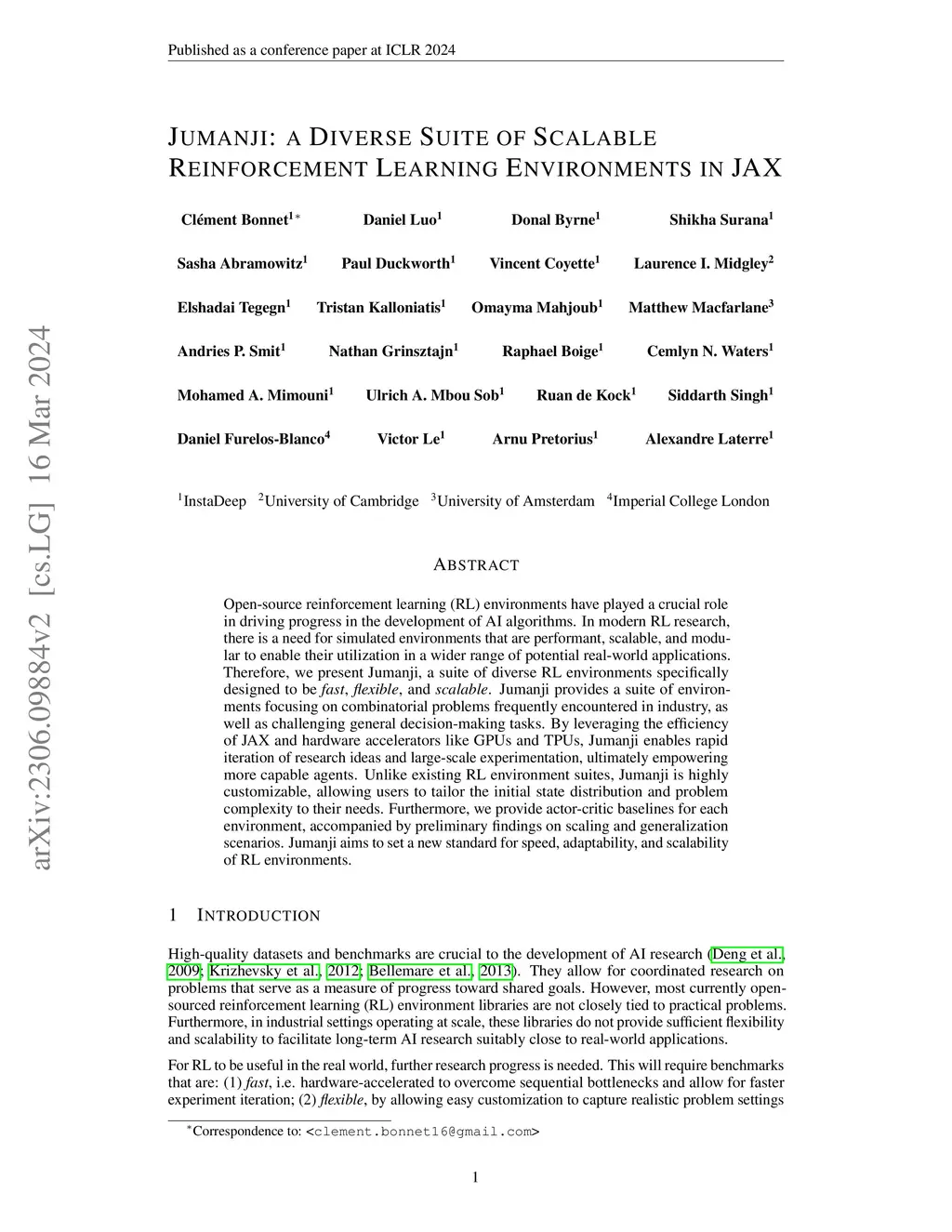 Jumanji: a Diverse Suite of Scalable Reinforcement Learning Environments in JAX