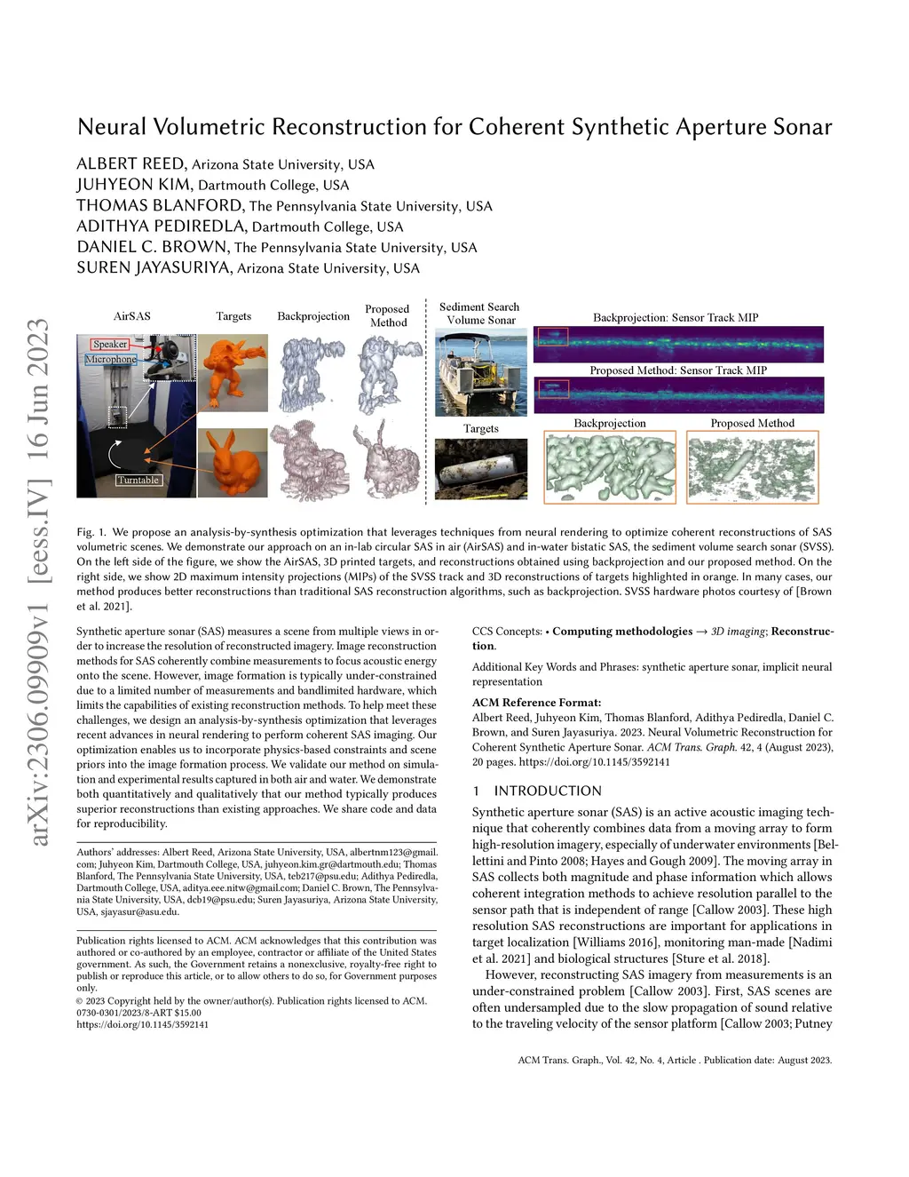 Synthetic aperture sonar (SAS) measures a scene from multiple views in order to increase the resolution of reconstructed imagery. Image reconstruction methods for SAS coherently combine measurements to focus acoustic energy onto the scene. However, image formation is typically under-constrained due to a limited number of measurements and bandlimited hardware, which limits the capabilities of existing reconstruction methods. To help meet these challenges, we design an analysis-by-synthesis optimization that leverages recent advances in neural rendering to perform coherent SAS imaging. Our optimization enables us to incorporate physics-based constraints and scene priors into the image formation process. We validate our method on simulation and experimental results captured in both air and water. We demonstrate both quantitatively and qualitatively that our method typically produces superior reconstructions than existing approaches. We share code and data for reproducibility.
