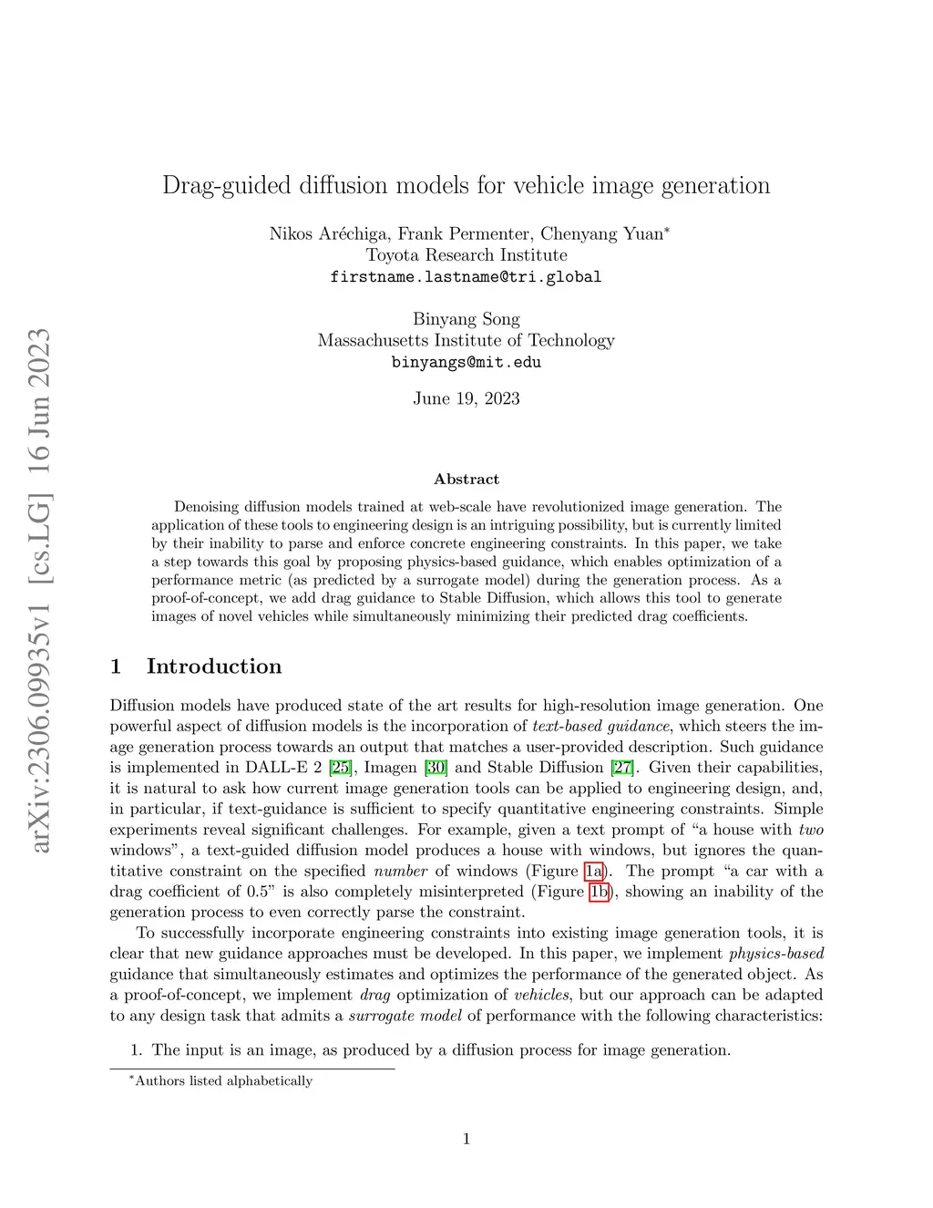 Denoising diffusion models trained at web-scale have revolutionized image generation. The application of these tools to engineering design is an intriguing possibility, but is currently limited by their inability to parse and enforce concrete engineering constraints. In this paper, we take a step towards this goal by proposing physics-based guidance, which enables optimization of a performance metric (as predicted by a surrogate model) during the generation process. As a proof-of-concept, we add drag guidance to Stable Diffusion, which allows this tool to generate images of novel vehicles while simultaneously minimizing their predicted drag coefficients.