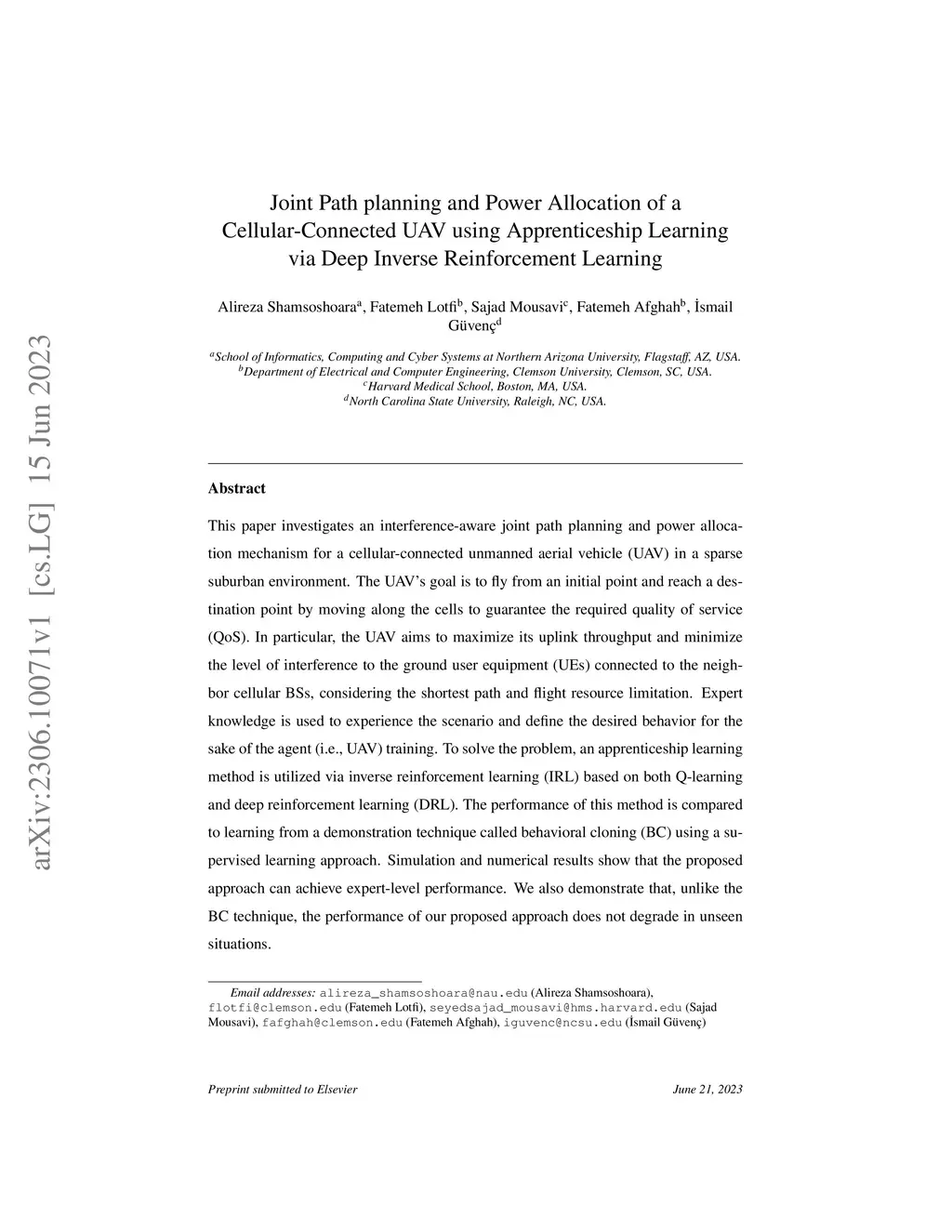 This paper investigates an interference-aware joint path planning and power allocation mechanism for a cellular-connected unmanned aerial vehicle (UAV) in a sparse suburban environment. The UAV's goal is to fly from an initial point and reach a destination point by moving along the cells to guarantee the required quality of service (QoS). In particular, the UAV aims to maximize its uplink throughput and minimize the level of interference to the ground user equipment (UEs) connected to the neighbor cellular BSs, considering the shortest path and flight resource limitation. Expert knowledge is used to experience the scenario and define the desired behavior for the sake of the agent (i.e., UAV) training. To solve the problem, an apprenticeship learning method is utilized via inverse reinforcement learning (IRL) based on both Q-learning and deep reinforcement learning (DRL). The performance of this method is compared to learning from a demonstration technique called behavioral cloning (BC) using a supervised learning approach. Simulation and numerical results show that the proposed approach can achieve expert-level performance. We also demonstrate that, unlike the BC technique, the performance of our proposed approach does not degrade in unseen situations.