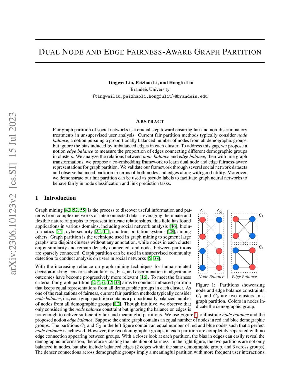 Fair graph partition of social networks is a crucial step toward ensuring fair and non-discriminatory treatments in unsupervised user analysis. Current fair partition methods typically consider node balance, a notion pursuing a proportionally balanced number of nodes from all demographic groups, but ignore the bias induced by imbalanced edges in each cluster. To address this gap, we propose a notion edge balance to measure the proportion of edges connecting different demographic groups in clusters. We analyze the relations between node balance and edge balance, then with line graph transformations, we propose a co-embedding framework to learn dual node and edge fairness-aware representations for graph partition. We validate our framework through several social network datasets and observe balanced partition in terms of both nodes and edges along with good utility. Moreover, we demonstrate our fair partition can be used as pseudo labels to facilitate graph neural networks to behave fairly in node classification and link prediction tasks.