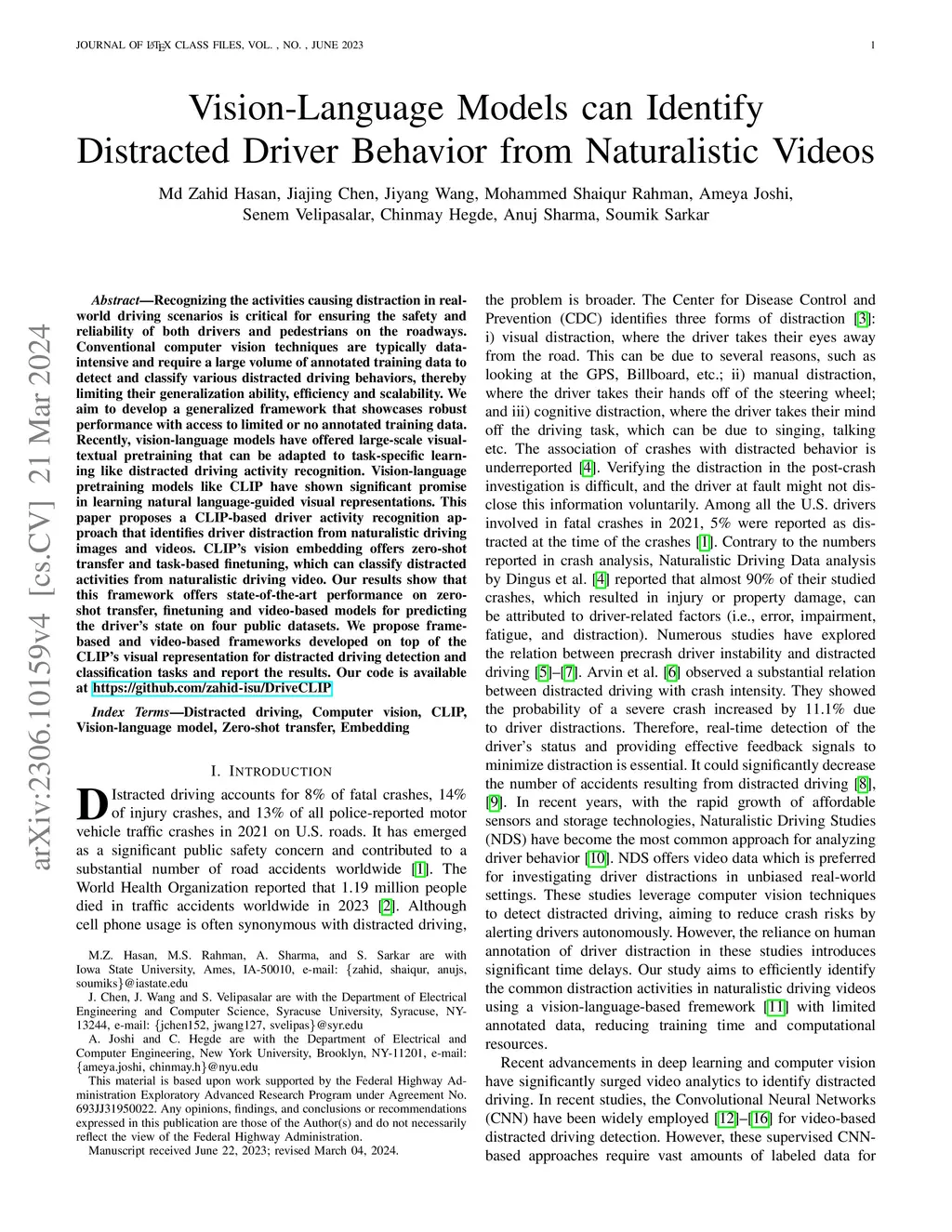 Recognizing the activities causing distraction in real-world driving scenarios is critical for ensuring the safety and reliability of both drivers and pedestrians on the roadways. Conventional computer vision techniques are typically data-intensive and require a large volume of annotated training data to detect and classify various distracted driving behaviors, thereby limiting their efficiency and scalability. We aim to develop a generalized framework that showcases robust performance with access to limited or no annotated training data. Recently, vision-language models have offered large-scale visual-textual pretraining that can be adapted to task-specific learning like distracted driving activity recognition. Vision-language pretraining models, such as CLIP, have shown significant promise in learning natural language-guided visual representations. This paper proposes a CLIP-based driver activity recognition approach that identifies driver distraction from naturalistic driving images and videos. CLIP's vision embedding offers zero-shot transfer and task-based finetuning, which can classify distracted activities from driving video data. Our results show that this framework offers state-of-the-art performance on zero-shot transfer and video-based CLIP for predicting the driver's state on two public datasets. We propose both frame-based and video-based frameworks developed on top of the CLIP's visual representation for distracted driving detection and classification tasks and report the results.