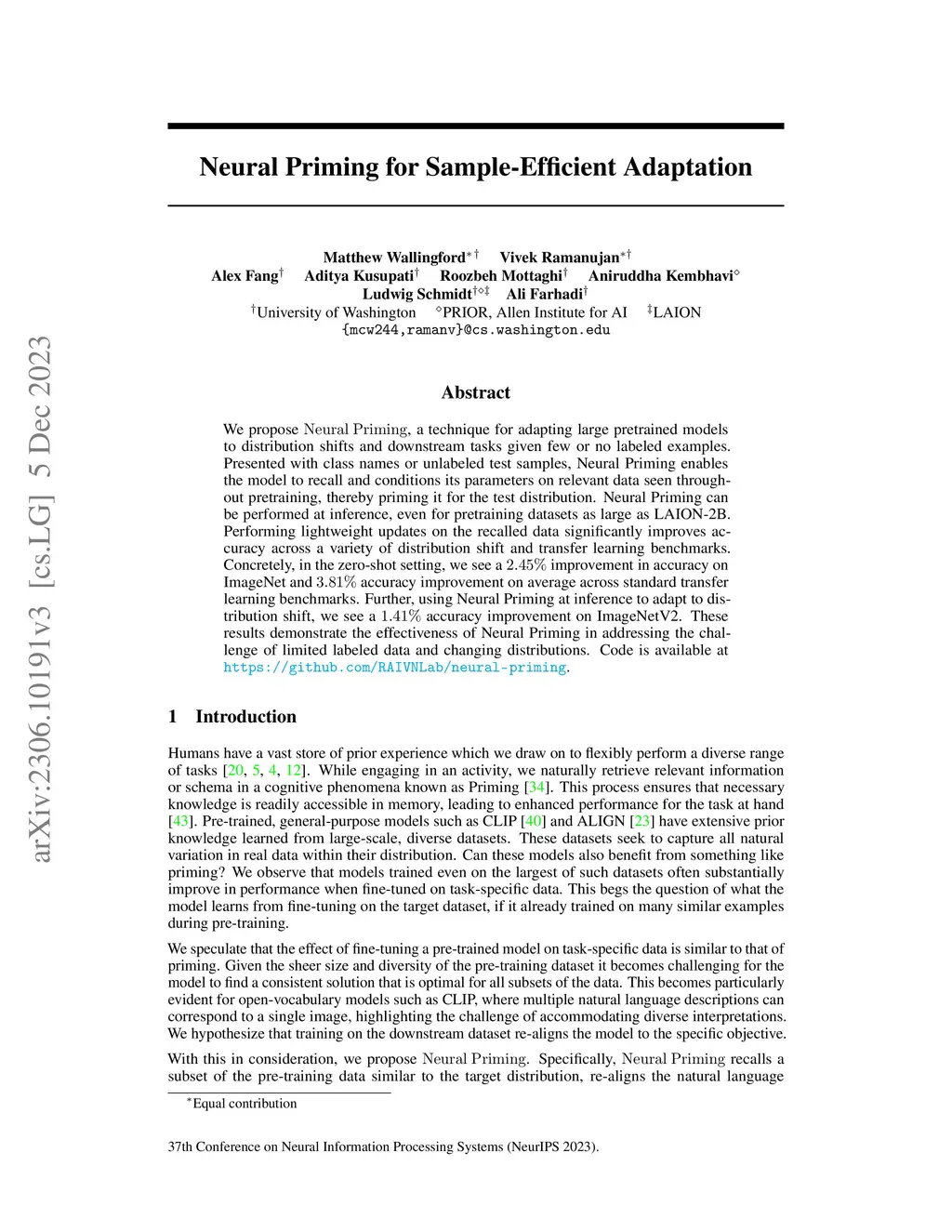 We propose Neural Priming, a technique for adapting large pretrained models to distribution shifts and downstream tasks given few or no labeled examples. Presented with class names or unlabeled test samples, Neural Priming enables the model to recall and conditions its parameters on relevant data seen throughout pretraining, thereby priming it for the test distribution. Neural Priming can be performed at test time, even for pretraining datasets as large as LAION-2B. Performing lightweight updates on the recalled data significantly improves accuracy across a variety of distribution shift and transfer learning benchmarks. Concretely, in the zero-shot setting, we see a 2.45% improvement in accuracy on ImageNet and 3.81% accuracy improvement on average across standard transfer learning benchmarks. Further, using Neural Priming at inference to adapt to distribution shift, we see a 1.41% accuracy improvement on ImageNetV2. These results demonstrate the effectiveness of Neural Priming in addressing the challenge of limited labeled data and changing distributions. Code is available at github.com/RAIVNLab/neural-priming.