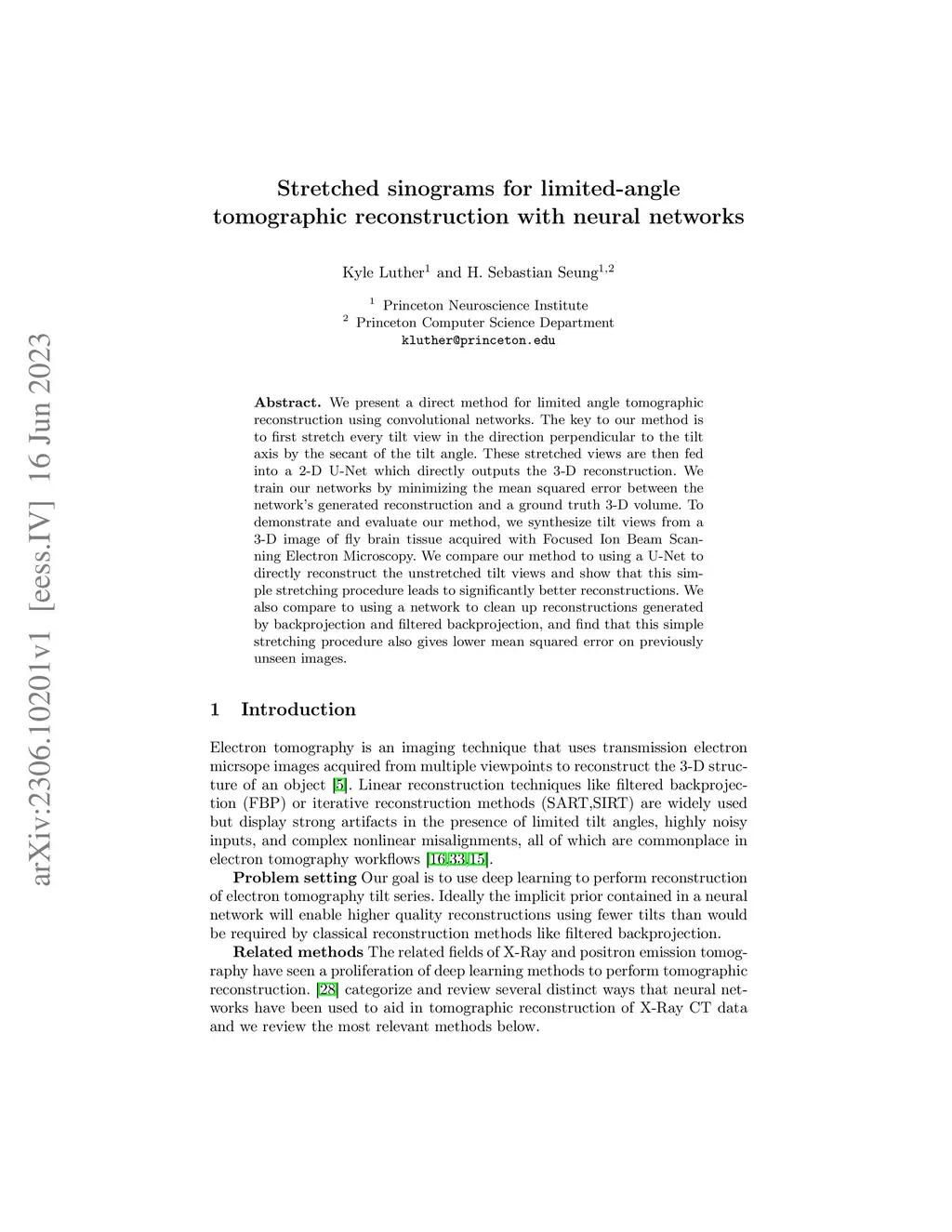 We present a direct method for limited angle tomographic reconstruction using convolutional networks. The key to our method is to first stretch every tilt view in the direction perpendicular to the tilt axis by the secant of the tilt angle. These stretched views are then fed into a 2-D U-Net which directly outputs the 3-D reconstruction. We train our networks by minimizing the mean squared error between the network's generated reconstruction and a ground truth 3-D volume. To demonstrate and evaluate our method, we synthesize tilt views from a 3-D image of fly brain tissue acquired with Focused Ion Beam Scanning Electron Microscopy. We compare our method to using a U-Net to directly reconstruct the unstretched tilt views and show that this simple stretching procedure leads to significantly better reconstructions. We also compare to using a network to clean up reconstructions generated by backprojection and filtered backprojection, and find that this simple stretching procedure also gives lower mean squared error on previously unseen images.