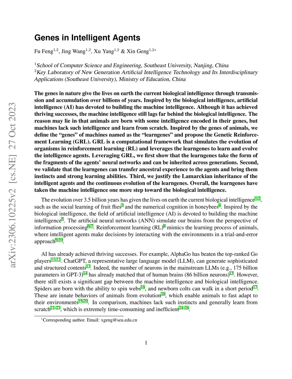 The genes in nature give the lives on earth the current biological intelligence through transmission and accumulation over billions of years. Inspired by the biological intelligence, artificial intelligence (AI) has devoted to building the machine intelligence. Although it has achieved thriving successes, the machine intelligence still lags far behind the biological intelligence. The reason may lie in that animals are born with some intelligence encoded in their genes, but machines lack such intelligence and learn from scratch. Inspired by the genes of animals, we define the ``genes'' of machines named as the ``learngenes'' and propose the Genetic Reinforcement Learning (GRL). GRL is a computational framework that simulates the evolution of organisms in reinforcement learning (RL) and leverages the learngenes to learn and evolve the intelligence agents. Leveraging GRL, we first show that the learngenes take the form of the fragments of the agents' neural networks and can be inherited across generations. Second, we validate that the learngenes can transfer ancestral experience to the agents and bring them instincts and strong learning abilities. Third, we justify the Lamarckian inheritance of the intelligent agents and the continuous evolution of the learngenes. Overall, the learngenes have taken the machine intelligence one more step toward the biological intelligence.