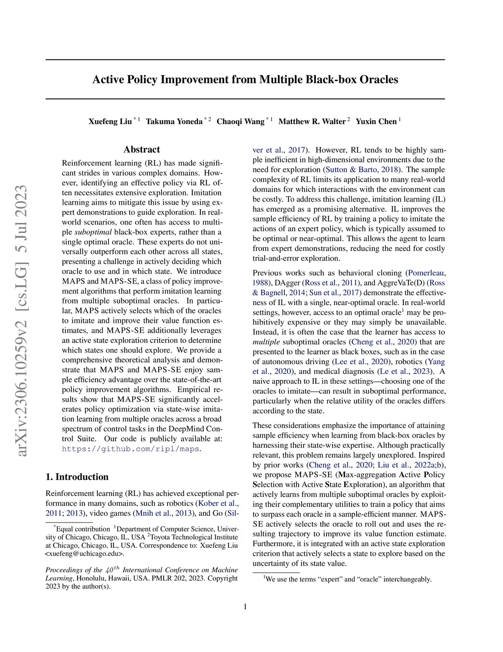 Reinforcement learning (RL) has made significant strides in various complex domains. However, identifying an effective policy via RL often necessitates extensive exploration. Imitation learning aims to mitigate this issue by using expert demonstrations to guide exploration. In real-world scenarios, one often has access to multiple suboptimal black-box experts, rather than a single optimal oracle. These experts do not universally outperform each other across all states, presenting a challenge in actively deciding which oracle to use and in which state. We introduce MAPS and MAPS-SE, a class of policy improvement algorithms that perform imitation learning from multiple suboptimal oracles. In particular, MAPS actively selects which of the oracles to imitate and improve their value function estimates, and MAPS-SE additionally leverages an active state exploration criterion to determine which states one should explore. We provide a comprehensive theoretical analysis and demonstrate that MAPS and MAPS-SE enjoy sample efficiency advantage over the state-of-the-art policy improvement algorithms. Empirical results show that MAPS-SE significantly accelerates policy optimization via state-wise imitation learning from multiple oracles across a broad spectrum of control tasks in the DeepMind Control Suite. Our code is publicly available at:this https URL.