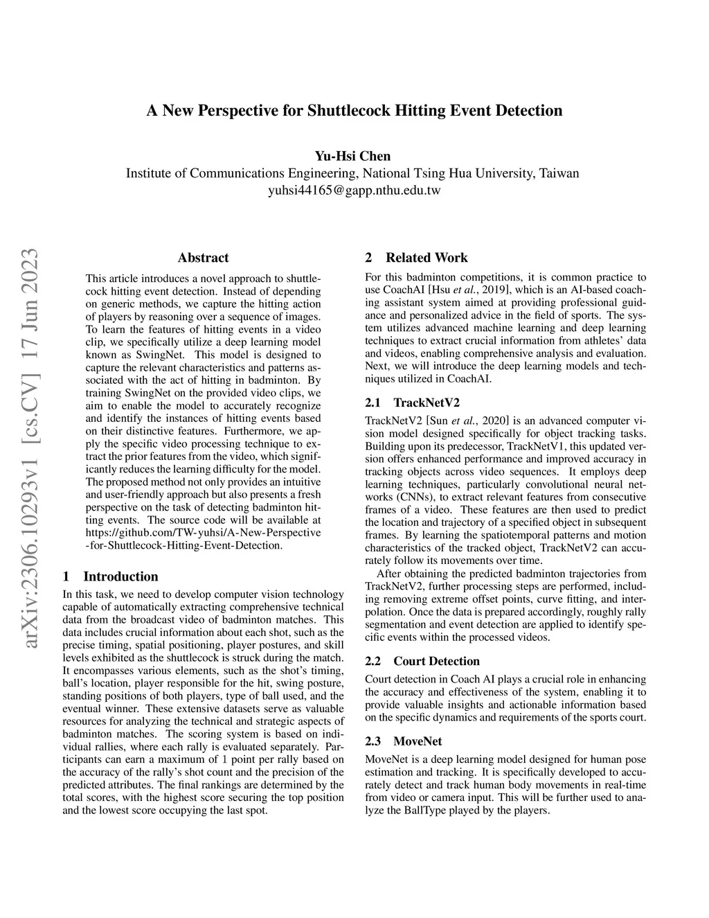 This article introduces a novel approach to shuttlecock hitting event detection. Instead of depending on generic methods, we capture the hitting action of players by reasoning over a sequence of images. To learn the features of hitting events in a video clip, we specifically utilize a deep learning model known as SwingNet. This model is designed to capture the relevant characteristics and patterns associated with the act of hitting in badminton. By training SwingNet on the provided video clips, we aim to enable the model to accurately recognize and identify the instances of hitting events based on their distinctive features. Furthermore, we apply the specific video processing technique to extract the prior features from the video, which significantly reduces the learning difficulty for the model. The proposed method not only provides an intuitive and user-friendly approach but also presents a fresh perspective on the task of detecting badminton hitting events. The source code will be available at https://github.com/TW-yuhsi/A-New-Perspective-for-Shuttlecock-Hitting-Event-Detection.