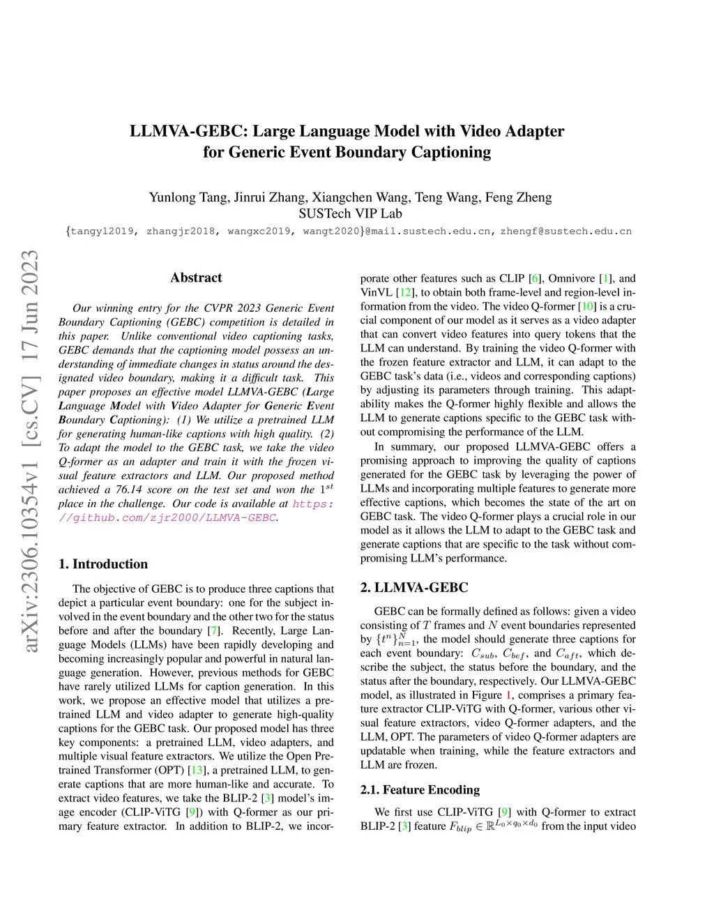 LLMVA-GEBC: Large Language Model with Video Adapter for Generic Event
