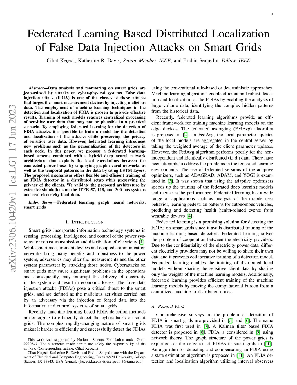 Data analysis and monitoring on smart grids are jeopardized by attacks on cyber-physical systems. False data injection attack (FDIA) is one of the classes of those attacks that target the smart measurement devices by injecting malicious data. The employment of machine learning techniques in the detection and localization of FDIA is proven to provide effective results. Training of such models requires centralized processing of sensitive user data that may not be plausible in a practical scenario. By employing federated learning for the detection of FDIA attacks, it is possible to train a model for the detection and localization of the attacks while preserving the privacy of sensitive user data. However, federated learning introduces new problems such as the personalization of the detectors in each node. In this paper, we propose a federated learning-based scheme combined with a hybrid deep neural network architecture that exploits the local correlations between the connected power buses by employing graph neural networks as well as the temporal patterns in the data by using LSTM layers. The proposed mechanism offers flexible and efficient training of an FDIA detector in a distributed setup while preserving the privacy of the clients. We validate the proposed architecture by extensive simulations on the IEEE 57, 118, and 300 bus systems and real electricity load data.
