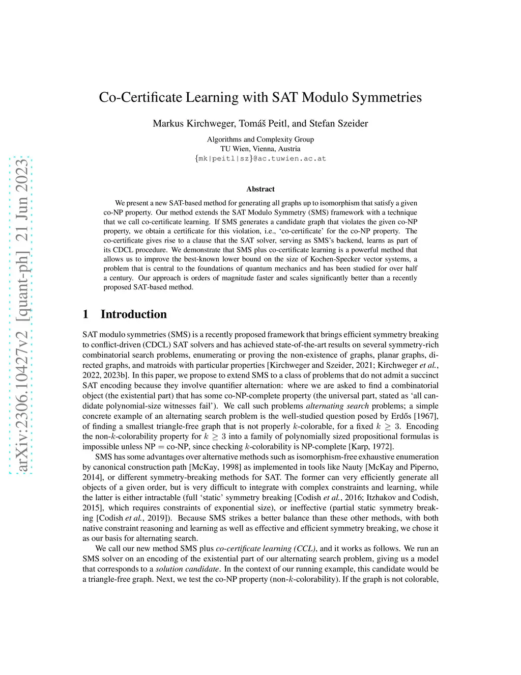 We present a new SAT-based method for generating all graphs up to isomorphism that satisfy a given co-NP property. Our method extends the SAT Modulo Symmetry (SMS) framework with a technique that we call co-certificate learning. If SMS generates a candidate graph that violates the given co-NP property, we obtain a certificate for this violation, i.e., `co-certificate' for the co-NP property. The co-certificate gives rise to a clause that the SAT solver, serving as SMS's backend, learns as part of its CDCL procedure. We demonstrate that SMS plus co-certificate learning is a powerful method that allows us to improve the best-known lower bound on the size of Kochen-Specker vector systems, a problem that is central to the foundations of quantum mechanics and has been studied for over half a century. Our approach is orders of magnitude faster and scales significantly better than a recently proposed SAT-based method.