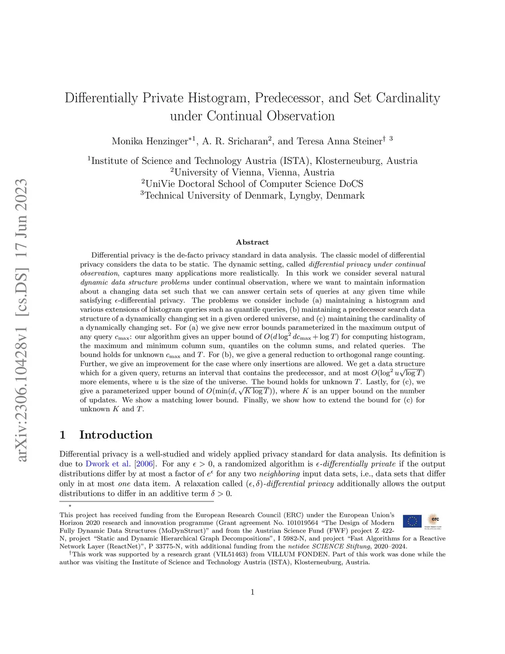 Differential privacy is the de-facto privacy standard in data analysis. The classic model of differential privacy considers the data to be static. The dynamic setting, called differential privacy under continual observation, captures many applications more realistically. In this work we consider several natural dynamic data structure problems under continual observation, where we want to maintain information about a changing data set such that we can answer certain sets of queries at any given time while satisfying -differential privacy. The problems we consider include (a) maintaining a histogram and various extensions of histogram queries such as quantile queries, (b) maintaining a predecessor search data structure of a dynamically changing set in a given ordered universe, and (c) maintaining the cardinality of a dynamically changing set. For (a) we give new error bounds parameterized in the maximum output of any query : our algorithm gives an upper bound of for computing histogram, the maximum and minimum column sum, quantiles on the column sums, and related queries. The bound holds for unknown and . For (b), we give a general reduction to orthogonal range counting. Further, we give an improvement for the case where only insertions are allowed. We get a data structure which for a given query, returns an interval that contains the predecessor, and at most more elements, where is the size of the universe. The bound holds for unknown . Lastly, for (c), we give a parameterized upper bound of , where is an upper bound on the number of updates. We show a matching lower bound. Finally, we show how to extend the bound for (c) for unknown and .