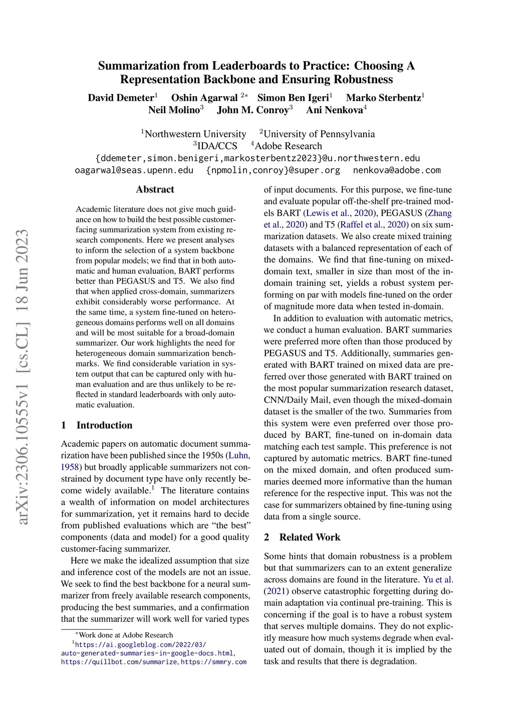 Academic literature does not give much guidance on how to build the best possible customer-facing summarization system from existing research components. Here we present analyses to inform the selection of a system backbone from popular models; we find that in both automatic and human evaluation, BART performs better than PEGASUS and T5. We also find that when applied cross-domain, summarizers exhibit considerably worse performance. At the same time, a system fine-tuned on heterogeneous domains performs well on all domains and will be most suitable for a broad-domain summarizer. Our work highlights the need for heterogeneous domain summarization benchmarks. We find considerable variation in system output that can be captured only with human evaluation and are thus unlikely to be reflected in standard leaderboards with only automatic evaluation.