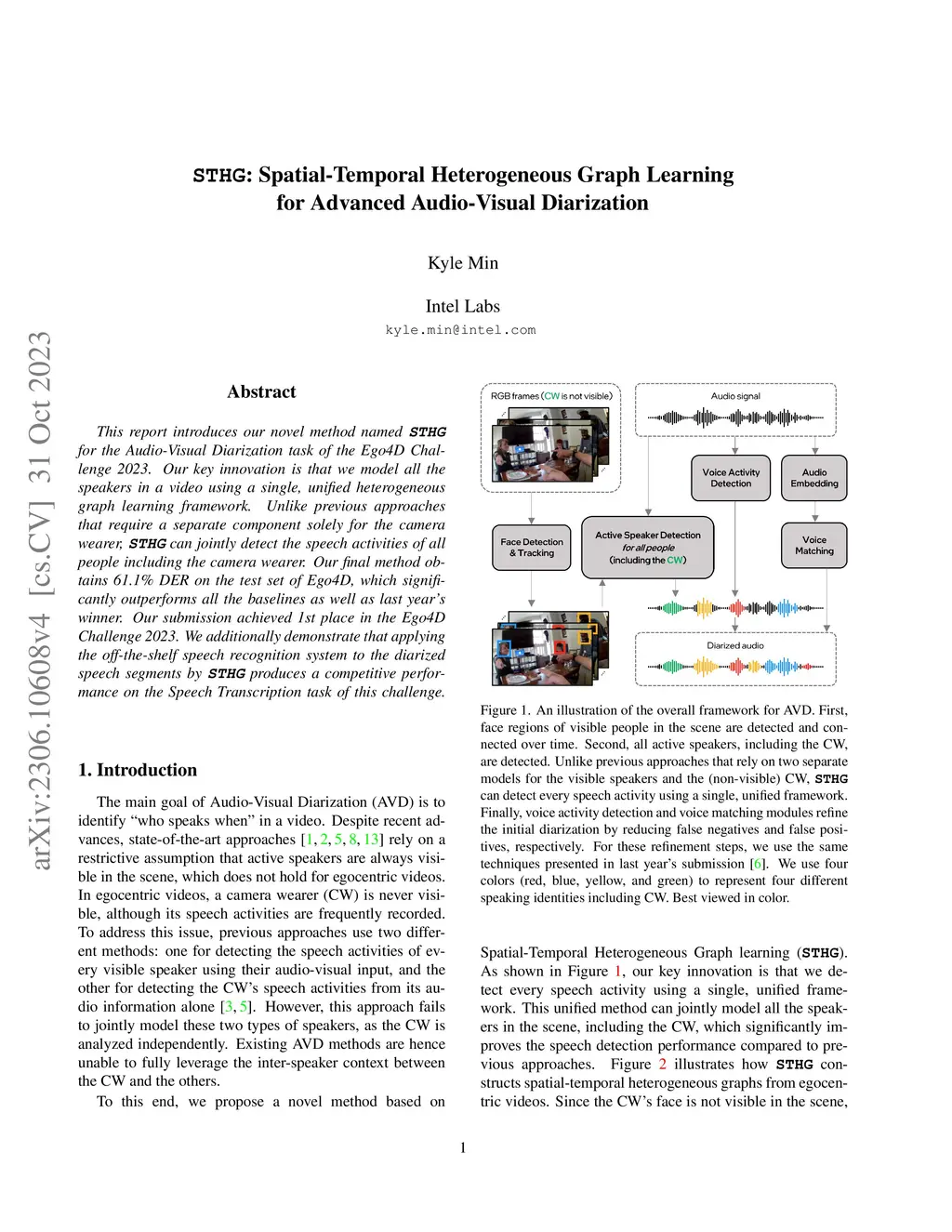 This report introduces our novel method named STHG for the Audio-Visual Diarization task of the Ego4D Challenge 2023. Our key innovation is that we model all the speakers in a video using a single, unified heterogeneous graph learning framework. Unlike previous approaches that require a separate component solely for the camera wearer, STHG can jointly detect the speech activities of all people including the camera wearer. Our final method obtains 61.1% DER on the test set of Ego4D, which significantly outperforms all the baselines as well as last year's winner. Our submission achieved 1st place in the Ego4D Challenge 2023. We additionally demonstrate that applying the off-the-shelf speech recognition system to the diarized speech segments by STHG produces a competitive performance on the Speech Transcription task of this challenge.