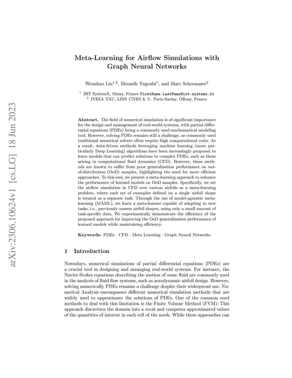 The field of numerical simulation is of significant importance for the design and management of real-world systems, with partial differential equations (PDEs) being a commonly used mathematical modeling tool. However, solving PDEs remains still a challenge, as commonly used traditional numerical solvers often require high computational costs. As a result, data-driven methods leveraging machine learning (more particularly Deep Learning) algorithms have been increasingly proposed to learn models that can predict solutions to complex PDEs, such as those arising in computational fluid dynamics (CFD). However, these methods are known to suffer from poor generalization performance on out-of-distribution (OoD) samples, highlighting the need for more efficient approaches. To this end, we present a meta-learning approach to enhance the performance of learned models on OoD samples. Specifically, we set the airflow simulation in CFD over various airfoils as a meta-learning problem, where each set of examples defined on a single airfoil shape is treated as a separate task. Through the use of model-agnostic meta-learning (MAML), we learn a meta-learner capable of adapting to new tasks, i.e., previously unseen airfoil shapes, using only a small amount of task-specific data. We experimentally demonstrate the efficiency of the proposed approach for improving the OoD generalization performance of learned models while maintaining efficiency.