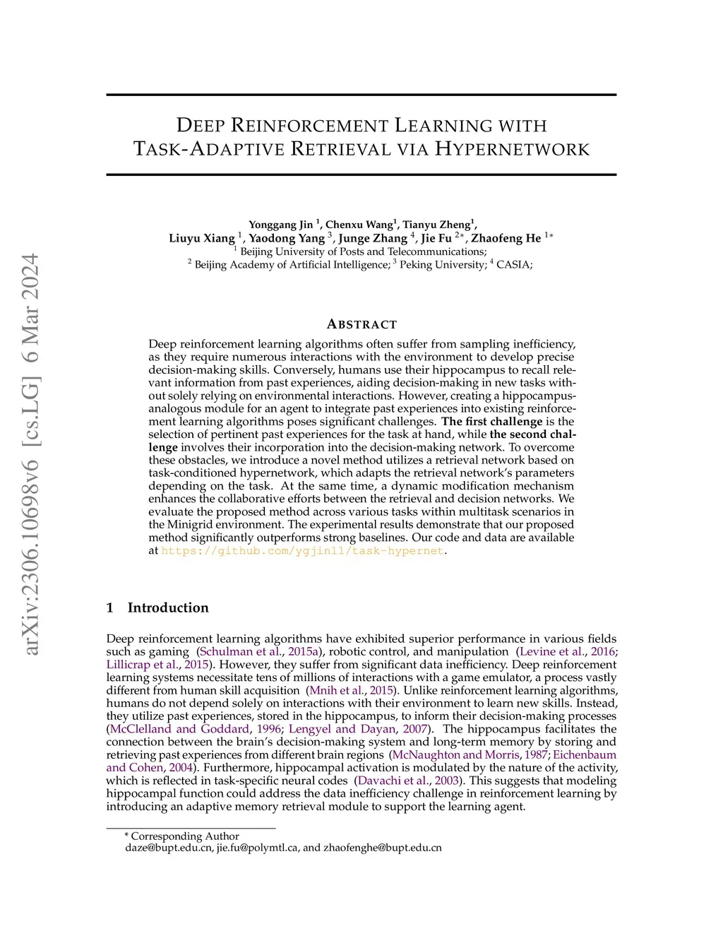 Deep reinforcement learning algorithms are usually impeded by sampling inefficiency, heavily depending on multiple interactions with the environment to acquire accurate decision-making capabilities. In contrast, humans rely on their hippocampus to retrieve relevant information from past experiences of relevant tasks, which guides their decision-making when learning a new task, rather than exclusively depending on environmental interactions. Nevertheless, designing a hippocampus-like module for an agent to incorporate past experiences into established reinforcement learning algorithms presents two challenges. The first challenge involves selecting the most relevant past experiences for the current task, and the second challenge is integrating such experiences into the decision network. To address these challenges, we propose a novel method that utilizes a retrieval network based on task-conditioned hypernetwork, which adapts the retrieval network's parameters depending on the task. At the same time, a dynamic modification mechanism enhances the collaborative efforts between the retrieval and decision networks. We evaluate the proposed method across various tasks within a multitask scenario in the Minigrid environment. The experimental results demonstrate that our proposed method significantly outperforms strong baselines.