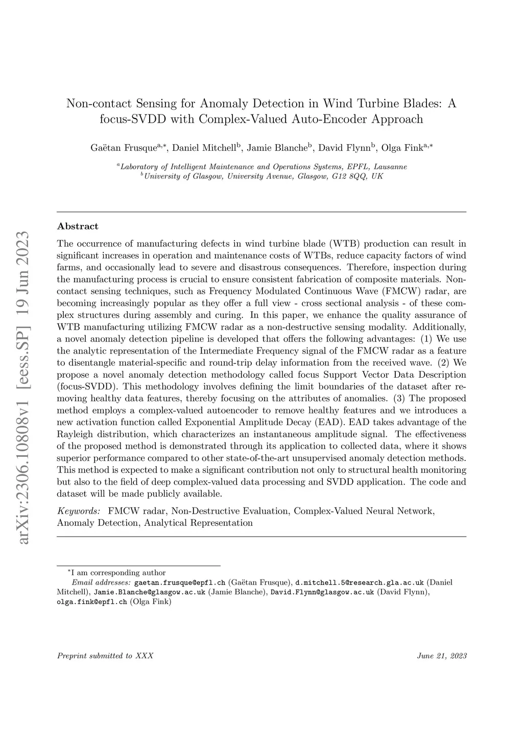 The occurrence of manufacturing defects in wind turbine blade (WTB) production can result in significant increases in operation and maintenance costs and lead to severe and disastrous consequences. Therefore, inspection during the manufacturing process is crucial to ensure consistent fabrication of composite materials. Non-contact sensing techniques, such as Frequency Modulated Continuous Wave (FMCW) radar, are becoming increasingly popular as they offer a full view of these complex structures during curing. In this paper, we enhance the quality assurance of manufacturing utilizing FMCW radar as a non-destructive sensing modality. Additionally, a novel anomaly detection pipeline is developed that offers the following advantages: (1) We use the analytic representation of the Intermediate Frequency signal of the FMCW radar as a feature to disentangle material-specific and round-trip delay information from the received wave. (2) We propose a novel anomaly detection methodology called focus Support Vector Data Description (focus-SVDD). This methodology involves defining the limit boundaries of the dataset after removing healthy data features, thereby focusing on the attributes of anomalies. (3) The proposed method employs a complex-valued autoencoder to remove healthy features and we introduces a new activation function called Exponential Amplitude Decay (EAD). EAD takes advantage of the Rayleigh distribution, which characterizes an instantaneous amplitude signal. The effectiveness of the proposed method is demonstrated through its application to collected data, where it shows superior performance compared to other state-of-the-art unsupervised anomaly detection methods. This method is expected to make a significant contribution not only to structural health monitoring but also to the field of deep complex-valued data processing and SVDD application.