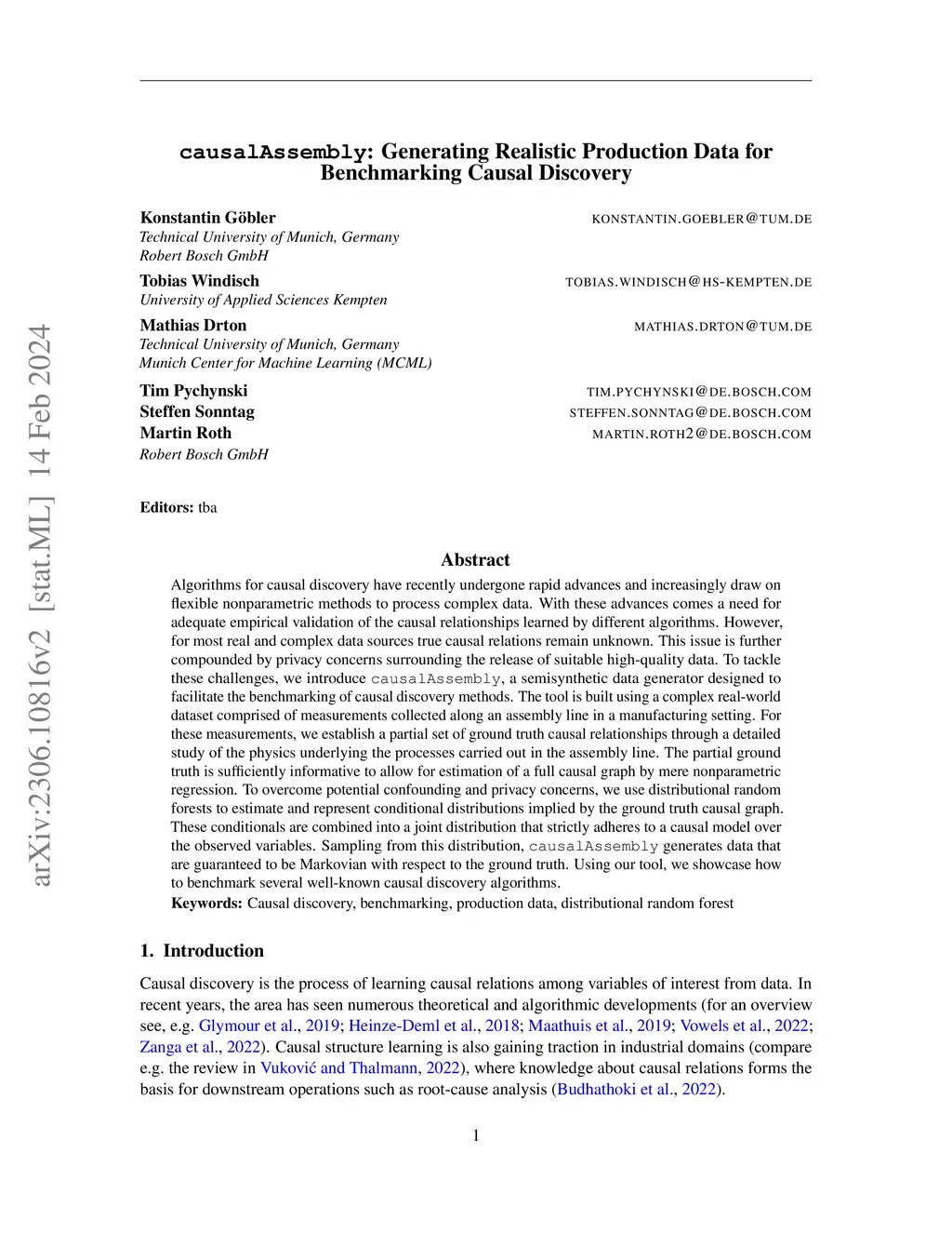 Algorithms for causal discovery have recently undergone rapid advances and increasingly draw on flexible nonparametric methods to process complex data. With these advances comes a need for adequate empirical validation of the causal relationships learned by different algorithms. However, for most real data sources true causal relations remain unknown. This issue is further compounded by privacy concerns surrounding the release of suitable high-quality data. To help address these challenges, we gather a complex dataset comprising measurements from an assembly line in a manufacturing context. This line consists of numerous physical processes for which we are able to provide ground truth causal relationships on the basis of a detailed study of the underlying physics. We use the assembly line data and associated ground truth information to build a system for generation of semisynthetic manufacturing data that supports benchmarking of causal discovery methods. To accomplish this, we employ distributional random forests in order to flexibly estimate and represent conditional distributions that may be combined into joint distributions that strictly adhere to a causal model over the observed variables. The estimated conditionals and tools for data generation are made available in our Python library . Using the library, we showcase how to benchmark several well-known causal discovery algorithms.