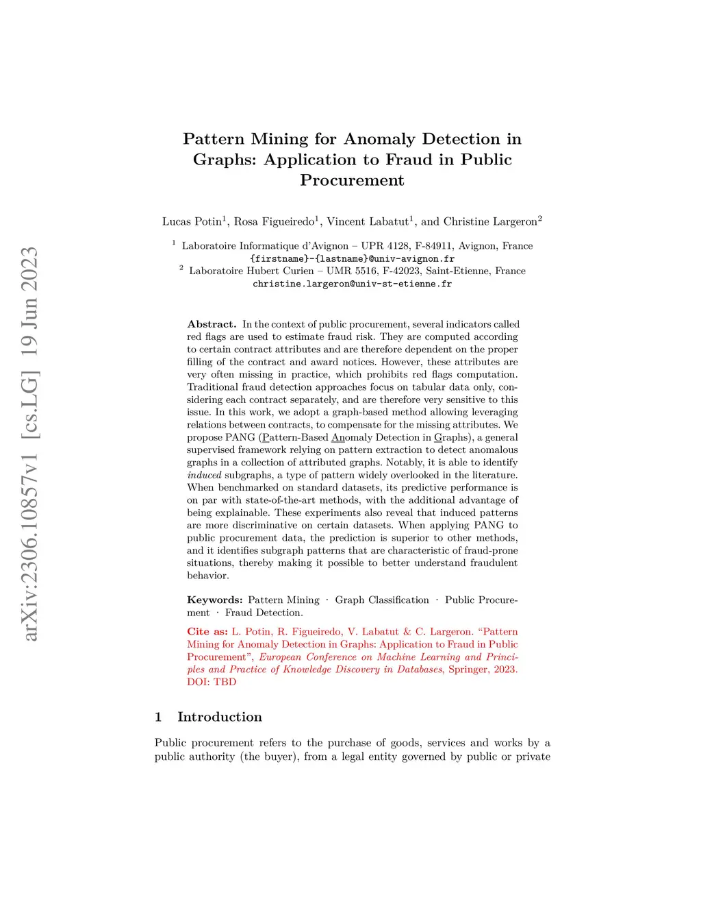 In the context of public procurement, several indicators called red flags are used to estimate fraud risk. They are computed according to certain contract attributes and are therefore dependent on the proper filling of the contract and award notices. However, these attributes are very often missing in practice, which prohibits red flags computation. Traditional fraud detection approaches focus on tabular data only, considering each contract separately, and are therefore very sensitive to this issue. In this work, we adopt a graph-based method allowing leveraging relations between contracts, to compensate for the missing attributes. We propose PANG (Pattern-Based Anomaly Detection in Graphs), a general supervised framework relying on pattern extraction to detect anomalous graphs in a collection of attributed graphs. Notably, it is able to identify induced subgraphs, a type of pattern widely overlooked in the literature. When benchmarked on standard datasets, its predictive performance is on par with state-of-the-art methods, with the additional advantage of being explainable. These experiments also reveal that induced patterns are more discriminative on certain datasets. When applying PANG to public procurement data, the prediction is superior to other methods, and it identifies subgraph patterns that are characteristic of fraud-prone situations, thereby making it possible to better understand fraudulent behavior.