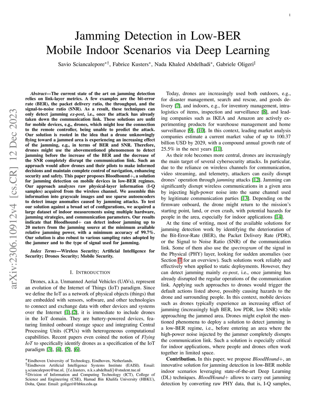 The current state of the art on jamming detection relies on link-layer metrics. A few examples are the bit-error-rate (BER), the packet delivery ratio, the throughput, and the increase in the signal-to-noise ratio (SNR). As a result, these techniques can only detect jamming \emph{ex-post}, i.e., once the attack has already taken down the communication link. These solutions are unfit for mobile devices, e.g., drones, which might lose the connection to the remote controller, being unable to predict the attack. Our solution is rooted in the idea that a drone unknowingly flying toward a jammed area is experiencing an increasing effect of the jamming, e.g., in terms of BER and SNR. Therefore, drones might use the above-mentioned phenomenon to detect jamming before the decrease of the BER and the increase of the SNR completely disrupt the communication link. Such an approach would allow drones and their pilots to make informed decisions and maintain complete control of navigation, enhancing security and safety. This paper proposes Bloodhound+, a solution for jamming detection on mobile devices in low-BER regimes. Our approach analyzes raw physical-layer information (I-Q samples) acquired from the wireless channel. We assemble this information into grayscale images and use sparse autoencoders to detect image anomalies caused by jamming attacks. To test our solution against a wide set of configurations, we acquired a large dataset of indoor measurements using multiple hardware, jamming strategies, and communication parameters. Our results indicate that Bloodhound+ can detect indoor jamming up to 20 meters from the jamming source at the minimum available relative jamming power, with a minimum accuracy of 99.7\%. Our solution is also robust to various sampling rates adopted by the jammer and to the type of signal used for jamming.