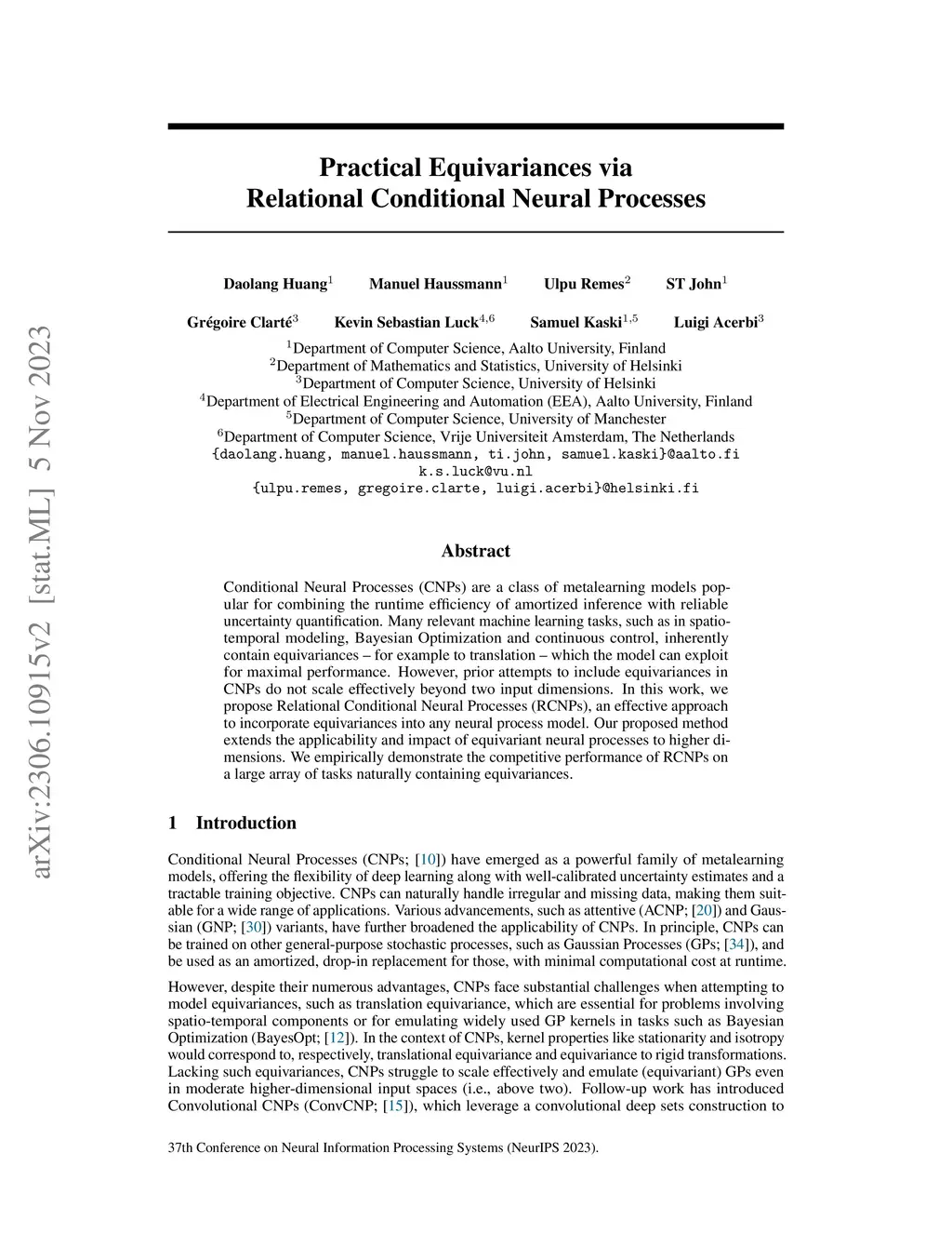 Conditional Neural Processes (CNPs) are a class of metalearning models popular for combining the runtime efficiency of amortized inference with reliable uncertainty quantification. Many relevant machine learning tasks, such as in spatio-temporal modeling, Bayesian Optimization and continuous control, inherently contain equivariances -- for example to translation -- which the model can exploit for maximal performance. However, prior attempts to include equivariances in CNPs do not scale effectively beyond two input dimensions. In this work, we propose Relational Conditional Neural Processes (RCNPs), an effective approach to incorporate equivariances into any neural process model. Our proposed method extends the applicability and impact of equivariant neural processes to higher dimensions. We empirically demonstrate the competitive performance of RCNPs on a large array of tasks naturally containing equivariances.
