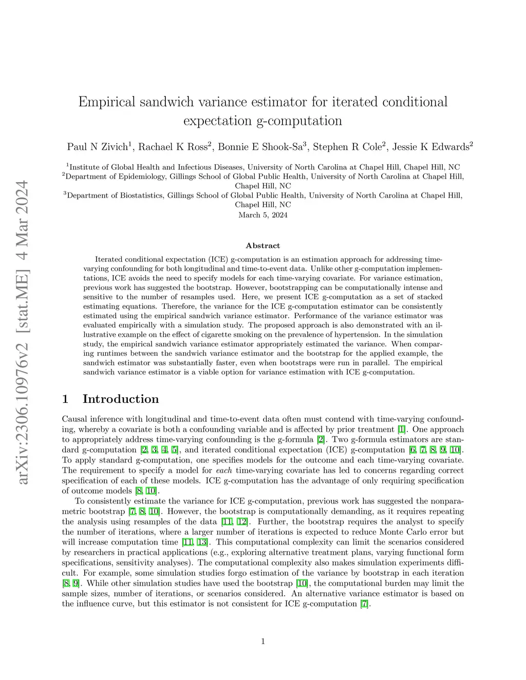 Iterated conditional expectation (ICE) g-computation is an estimation approach for addressing time-varying confounding for both longitudinal and time-to-event data. Unlike other g-computation implementations, ICE avoids the need to specify models for each time-varying covariate. For variance estimation, previous work has suggested the bootstrap. However, bootstrapping can be computationally intense and sensitive to the number of resamples used. Here, we present ICE g-computation as a set of stacked estimating equations. Therefore, the variance for the ICE g-computation estimator can be consistently estimated using the empirical sandwich variance estimator. Performance of the variance estimator was evaluated empirically with a simulation study. The proposed approach is also demonstrated with an illustrative example on the effect of cigarette smoking on the prevalence of hypertension. In the simulation study, the empirical sandwich variance estimator appropriately estimated the variance. When comparing runtimes between the sandwich variance estimator and the bootstrap for the applied example, the sandwich estimator was substantially faster, even when bootstraps were run in parallel. The empirical sandwich variance estimator is a viable option for variance estimation with ICE g-computation.