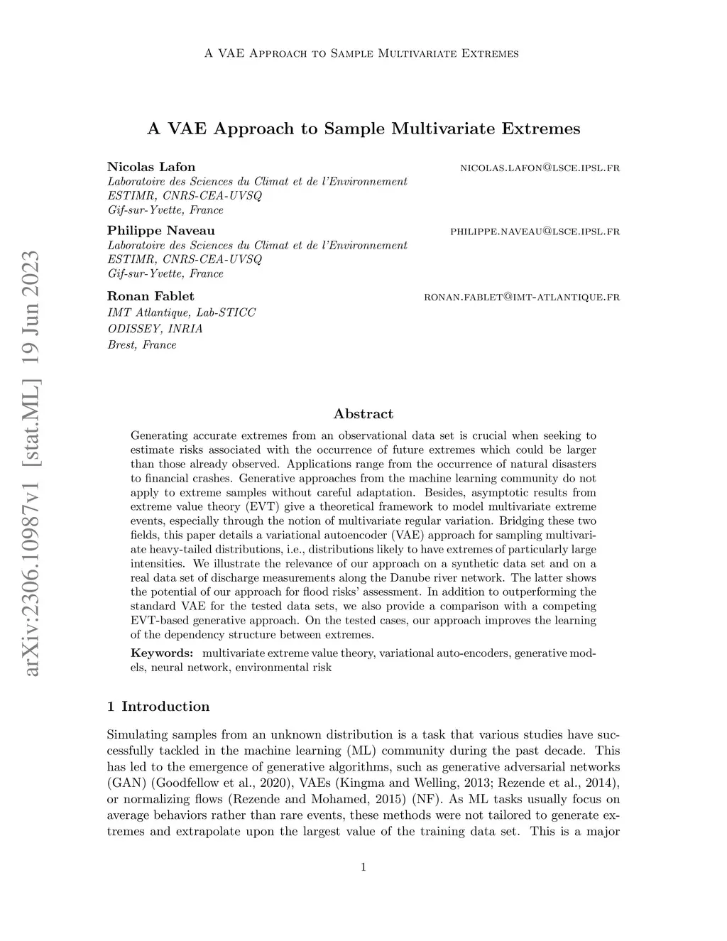 Generating accurate extremes from an observational data set is crucial when seeking to estimate risks associated with the occurrence of future extremes which could be larger than those already observed. Applications range from the occurrence of natural disasters to financial crashes. Generative approaches from the machine learning community do not apply to extreme samples without careful adaptation. Besides, asymptotic results from extreme value theory (EVT) give a theoretical framework to model multivariate extreme events, especially through the notion of multivariate regular variation. Bridging these two fields, this paper details a variational autoencoder (VAE) approach for sampling multivariate heavy-tailed distributions, i.e., distributions likely to have extremes of particularly large intensities. We illustrate the relevance of our approach on a synthetic data set and on a real data set of discharge measurements along the Danube river network. The latter shows the potential of our approach for flood risks' assessment. In addition to outperforming the standard VAE for the tested data sets, we also provide a comparison with a competing EVT-based generative approach. On the tested cases, our approach improves the learning of the dependency structure between extremes.