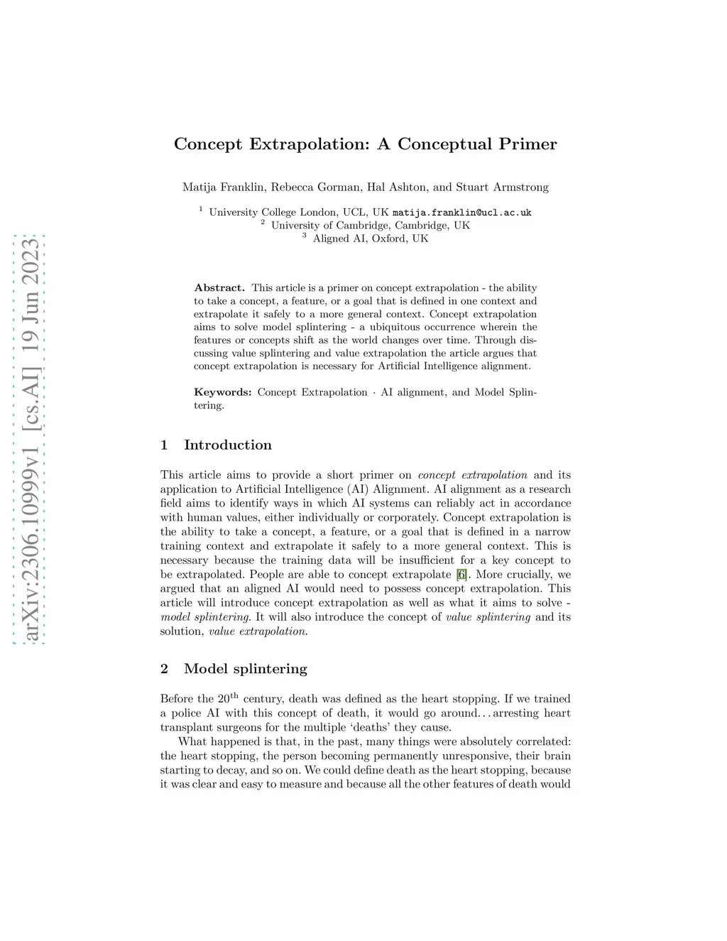 This article is a primer on concept extrapolation - the ability to take a concept, a feature, or a goal that is defined in one context and extrapolate it safely to a more general context. Concept extrapolation aims to solve model splintering - a ubiquitous occurrence wherein the features or concepts shift as the world changes over time. Through discussing value splintering and value extrapolation the article argues that concept extrapolation is necessary for Artificial Intelligence alignment.
