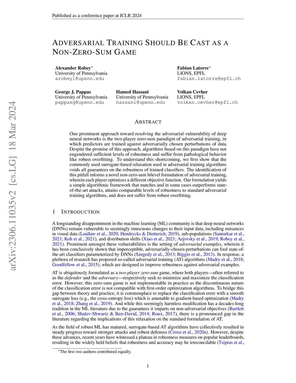 Adversarial Training Should Be Cast as a Non-Zero-Sum Game