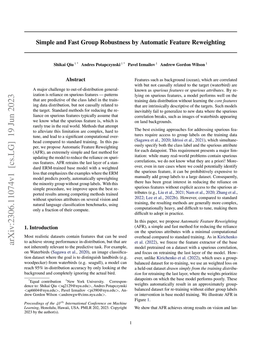 A major challenge to out-of-distribution generalization is reliance on spurious features -- patterns that are predictive of the class label in the training data distribution, but not causally related to the target. Standard methods for reducing the reliance on spurious features typically assume that we know what the spurious feature is, which is rarely true in the real world. Methods that attempt to alleviate this limitation are complex, hard to tune, and lead to a significant computational overhead compared to standard training. In this paper, we propose Automatic Feature Reweighting (AFR), an extremely simple and fast method for updating the model to reduce the reliance on spurious features. AFR retrains the last layer of a standard ERM-trained base model with a weighted loss that emphasizes the examples where the ERM model predicts poorly, automatically upweighting the minority group without group labels. With this simple procedure, we improve upon the best reported results among competing methods trained without spurious attributes on several vision and natural language classification benchmarks, using only a fraction of their compute.