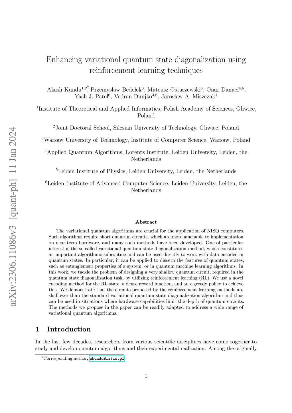 The variational quantum algorithms are crucial for the application of NISQ computers. Such algorithms require short quantum circuits, which are more amenable to implementation on near-term hardware, and many such methods have been developed. One of particular interest is the so-called variational quantum state diagonalization method, which constitutes an important algorithmic subroutine and can be used directly to work with data encoded in quantum states. In particular, it can be applied to discern the features of quantum states, such as entanglement properties of a system, or in quantum machine learning algorithms. In this work, we tackle the problem of designing a very shallow quantum circuit, required in the quantum state diagonalization task, by utilizing reinforcement learning (RL). We use a novel encoding method for the RL-state, a dense reward function, and an -greedy policy to achieve this. We demonstrate that the circuits proposed by the reinforcement learning methods are shallower than the standard variational quantum state diagonalization algorithm and thus can be used in situations where hardware capabilities limit the depth of quantum circuits. The methods we propose in the paper can be readily adapted to address a wide range of variational quantum algorithms.