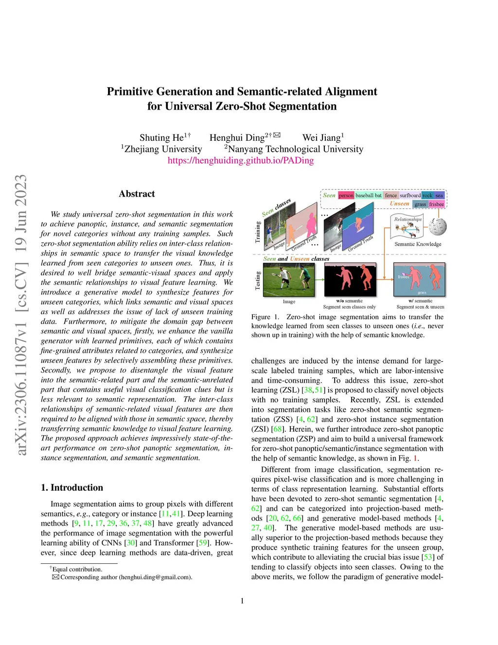 We study universal zero-shot segmentation in this work to achieve panoptic, instance, and semantic segmentation for novel categories without any training samples. Such zero-shot segmentation ability relies on inter-class relationships in semantic space to transfer the visual knowledge learned from seen categories to unseen ones. Thus, it is desired to well bridge semantic-visual spaces and apply the semantic relationships to visual feature learning. We introduce a generative model to synthesize features for unseen categories, which links semantic and visual spaces as well as addresses the issue of lack of unseen training data. Furthermore, to mitigate the domain gap between semantic and visual spaces, firstly, we enhance the vanilla generator with learned primitives, each of which contains fine-grained attributes related to categories, and synthesize unseen features by selectively assembling these primitives. Secondly, we propose to disentangle the visual feature into the semantic-related part and the semantic-unrelated part that contains useful visual classification clues but is less relevant to semantic representation. The inter-class relationships of semantic-related visual features are then required to be aligned with those in semantic space, thereby transferring semantic knowledge to visual feature learning. The proposed approach achieves impressively state-of-the-art performance on zero-shot panoptic segmentation, instance segmentation, and semantic segmentation. Code is available at https://henghuiding.github.io/PADing/.