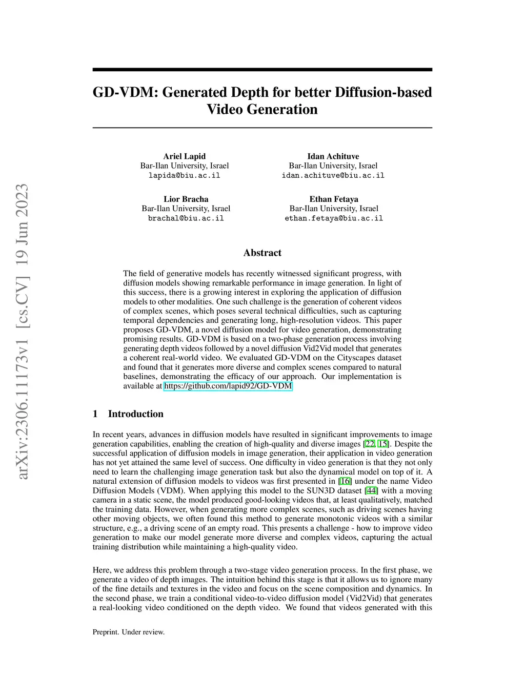 The field of generative models has recently witnessed significant progress, with diffusion models showing remarkable performance in image generation. In light of this success, there is a growing interest in exploring the application of diffusion models to other modalities. One such challenge is the generation of coherent videos of complex scenes, which poses several technical difficulties, such as capturing temporal dependencies and generating long, high-resolution videos. This paper proposes GD-VDM, a novel diffusion model for video generation, demonstrating promising results. GD-VDM is based on a two-phase generation process involving generating depth videos followed by a novel diffusion Vid2Vid model that generates a coherent real-world video. We evaluated GD-VDM on the Cityscapes dataset and found that it generates more diverse and complex scenes compared to natural baselines, demonstrating the efficacy of our approach.