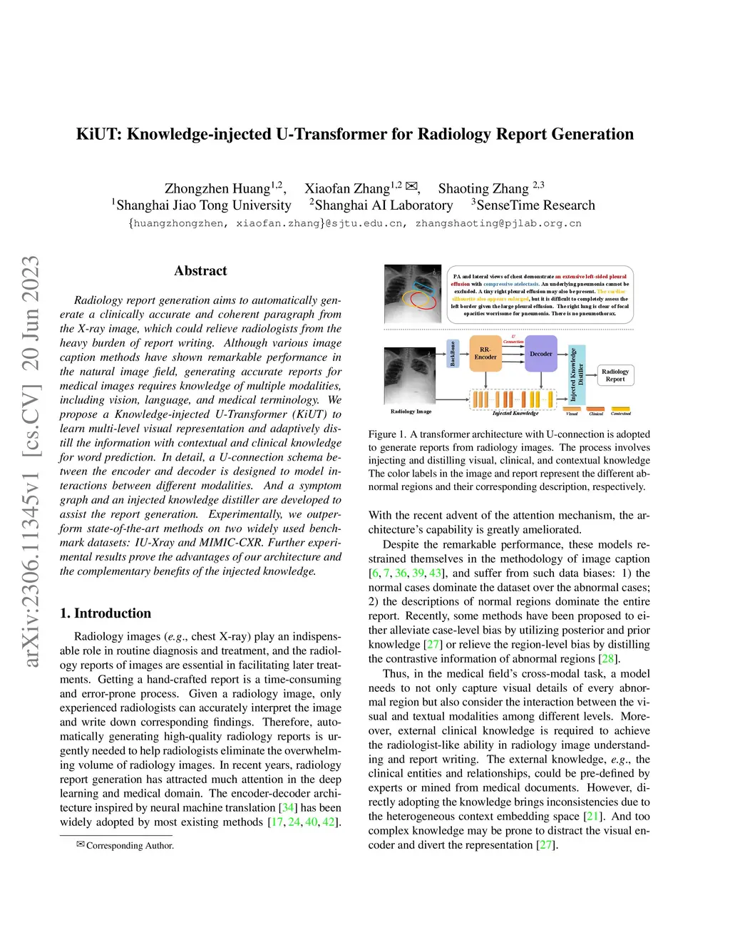 KiUT: Knowledge-injected U-Transformer for Radiology Report Generation