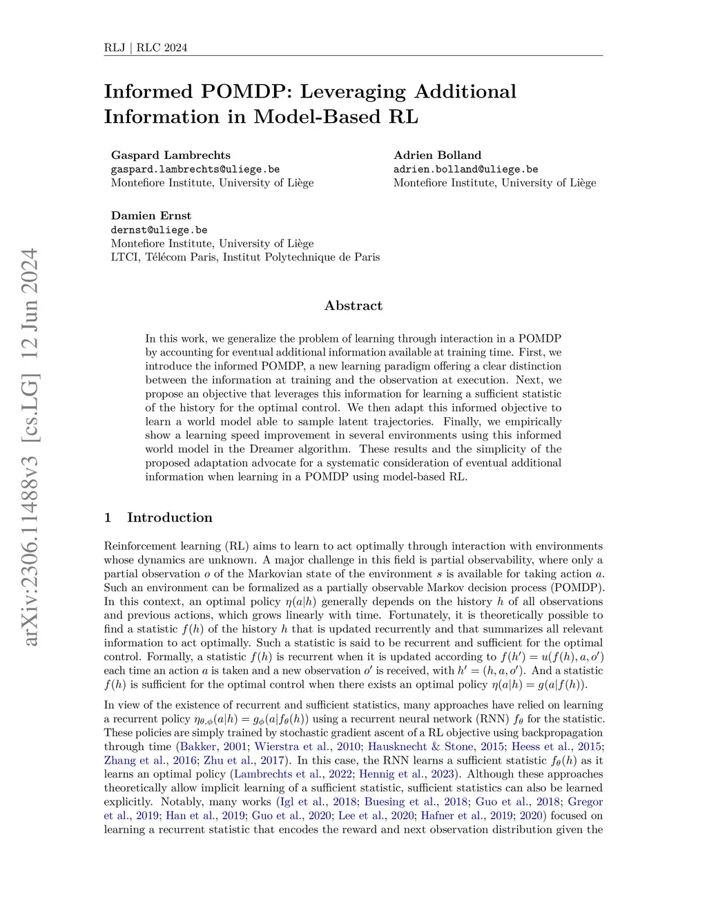 In this work, we generalize the problem of learning through interaction in a POMDP by accounting for eventual additional information available at training time. First, we introduce the informed POMDP, a new learning paradigm offering a clear distinction between the information at training and the observation at execution. Next, we propose an objective that leverages this information for learning a sufficient statistic of the history for the optimal control. We then adapt this informed objective to learn a world model able to sample latent trajectories. Finally, we empirically show a learning speed improvement in several environments using this informed world model in the Dreamer algorithm. These results and the simplicity of the proposed adaptation advocate for a systematic consideration of eventual additional information when learning in a POMDP using model-based RL.