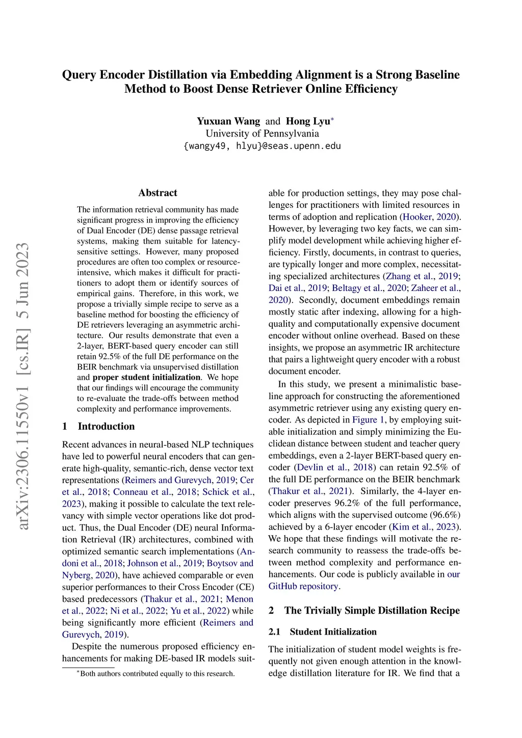 The information retrieval community has made significant progress in improving the efficiency of Dual Encoder (DE) dense passage retrieval systems, making them suitable for latency-sensitive settings. However, many proposed procedures are often too complex or resource-intensive, which makes it difficult for practitioners to adopt them or identify sources of empirical gains. Therefore, in this work, we propose a trivially simple recipe to serve as a baseline method for boosting the efficiency of DE retrievers leveraging an asymmetric architecture. Our results demonstrate that even a 2-layer, BERT-based query encoder can still retain 92.5% of the full DE performance on the BEIR benchmark via unsupervised distillation and proper student initialization. We hope that our findings will encourage the community to re-evaluate the trade-offs between method complexity and performance improvements.