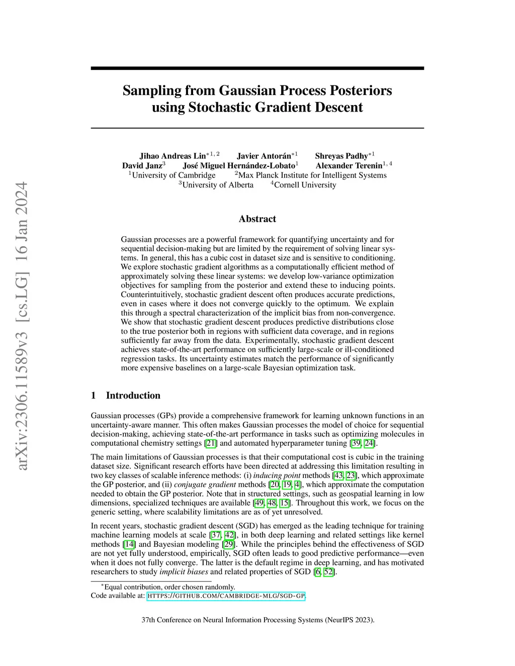 Gaussian processes are a powerful framework for quantifying uncertainty and for sequential decision-making but are limited by the requirement of solving linear systems. In general, this has a cubic cost in dataset size and is sensitive to conditioning. We explore stochastic gradient algorithms as a computationally efficient method of approximately solving these linear systems: we develop low-variance optimization objectives for sampling from the posterior and extend these to inducing points. Counterintuitively, stochastic gradient descent often produces accurate predictions, even in cases where it does not converge quickly to the optimum. We explain this through a spectral characterization of the implicit bias from non-convergence. We show that stochastic gradient descent produces predictive distributions close to the true posterior both in regions with sufficient data coverage, and in regions sufficiently far away from the data. Experimentally, stochastic gradient descent achieves state-of-the-art performance on sufficiently large-scale or ill-conditioned regression tasks. Its uncertainty estimates match the performance of significantly more expensive baselines on a large-scale Bayesian optimization task.