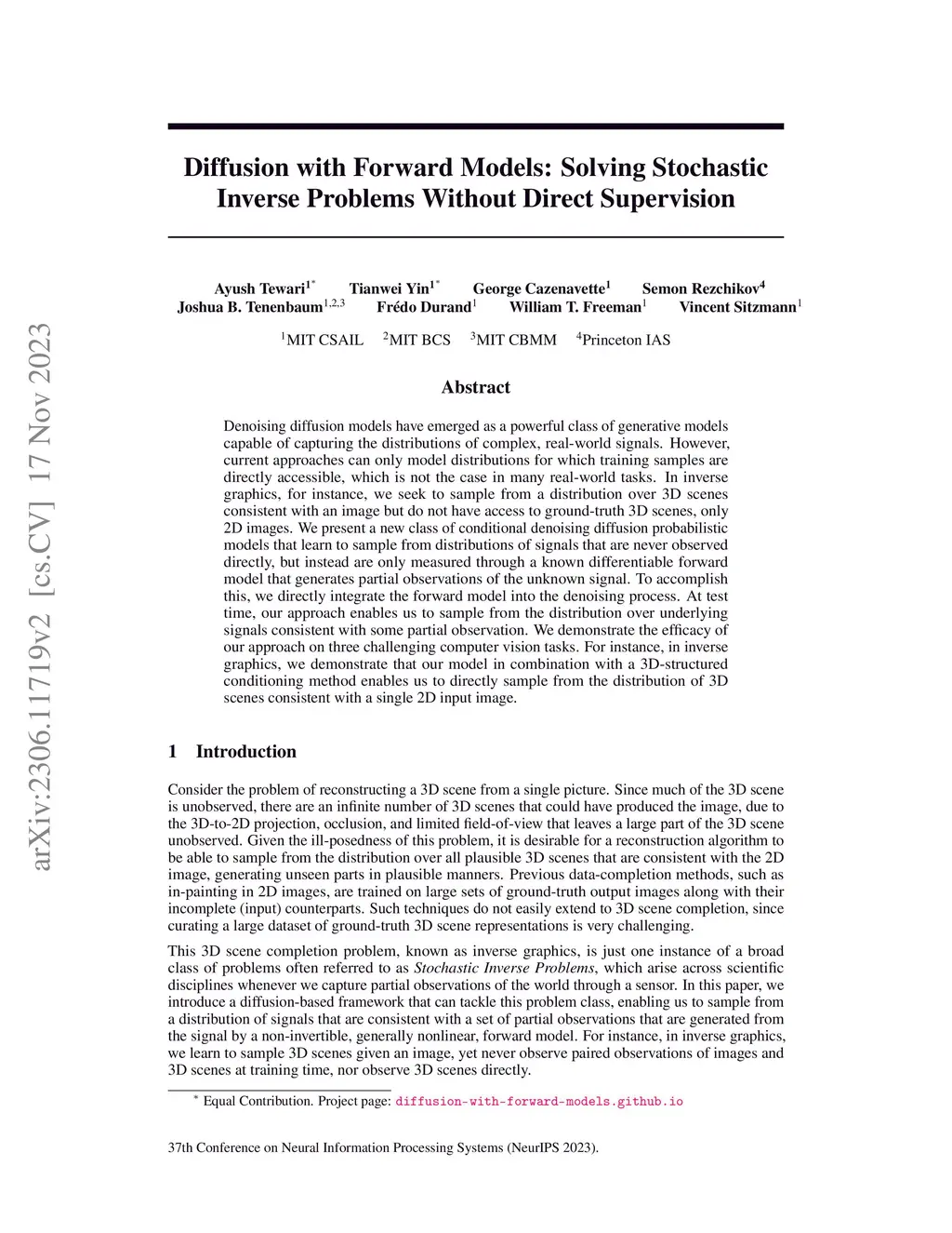 Denoising diffusion models are a powerful type of generative models used to capture complex distributions of real-world signals. However, their applicability is limited to scenarios where training samples are readily available, which is not always the case in real-world applications. For example, in inverse graphics, the goal is to generate samples from a distribution of 3D scenes that align with a given image, but ground-truth 3D scenes are unavailable and only 2D images are accessible. To address this limitation, we propose a novel class of denoising diffusion probabilistic models that learn to sample from distributions of signals that are never directly observed. Instead, these signals are measured indirectly through a known differentiable forward model, which produces partial observations of the unknown signal. Our approach involves integrating the forward model directly into the denoising process. This integration effectively connects the generative modeling of observations with the generative modeling of the underlying signals, allowing for end-to-end training of a conditional generative model over signals. During inference, our approach enables sampling from the distribution of underlying signals that are consistent with a given partial observation. We demonstrate the effectiveness of our method on three challenging computer vision tasks. For instance, in the context of inverse graphics, our model enables direct sampling from the distribution of 3D scenes that align with a single 2D input image.
