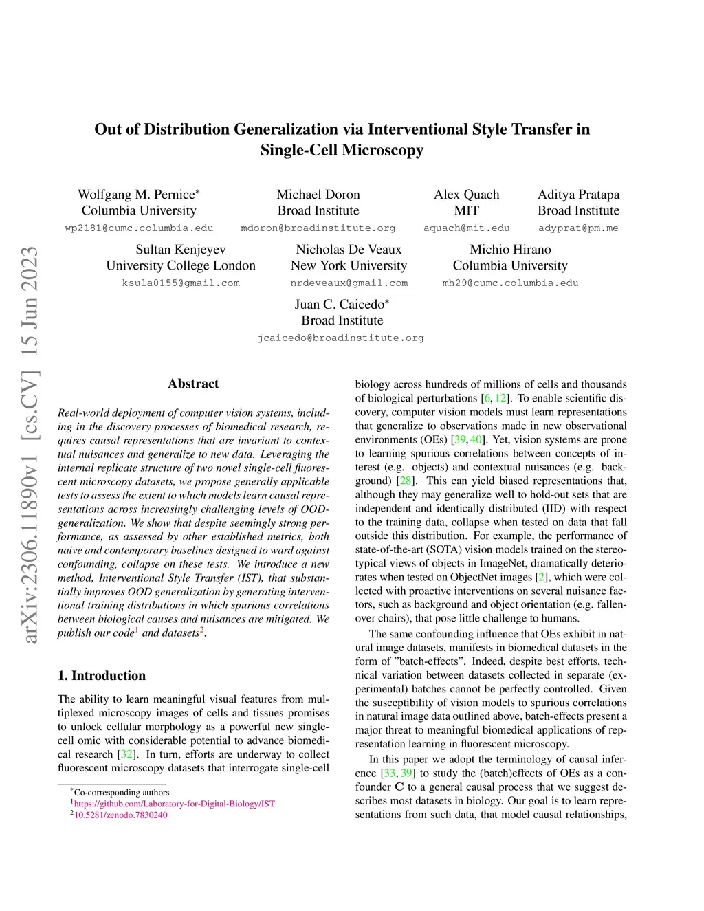 Real-world deployment of computer vision systems, including in the discovery processes of biomedical research, requires causal representations that are invariant to contextual nuisances and generalize to new data. Leveraging the internal replicate structure of two novel single-cell fluorescent microscopy datasets, we propose generally applicable tests to assess the extent to which models learn causal representations across increasingly challenging levels of OOD-generalization. We show that despite seemingly strong performance, as assessed by other established metrics, both naive and contemporary baselines designed to ward against confounding, collapse on these tests. We introduce a new method, Interventional Style Transfer (IST), that substantially improves OOD generalization by generating interventional training distributions in which spurious correlations between biological causes and nuisances are mitigated. We publish our code and datasets.