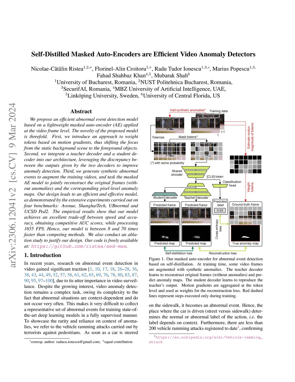 We propose an efficient abnormal event detection model based on a lightweight masked auto-encoder (AE) applied at the video frame level. The novelty of the proposed model is threefold. First, we introduce an approach to weight tokens based on motion gradients, thus shifting the focus from the static background scene to the foreground objects. Second, we integrate a teacher decoder and a student decoder into our architecture, leveraging the discrepancy between the outputs given by the two decoders to improve anomaly detection. Third, we generate synthetic abnormal events to augment the training videos, and task the masked AE model to jointly reconstruct the original frames (without anomalies) and the corresponding pixel-level anomaly maps. Our design leads to an efficient and effective model, as demonstrated by the extensive experiments carried out on four benchmarks: Avenue, ShanghaiTech, UBnormal and UCSD Ped2. The empirical results show that our model achieves an excellent trade-off between speed and accuracy, obtaining competitive AUC scores, while processing 1655 FPS. Hence, our model is between 8 and 70 times faster than competing methods. We also conduct an ablation study to justify our design. Our code is freely available at: https://github.com/ristea/aed-mae.
