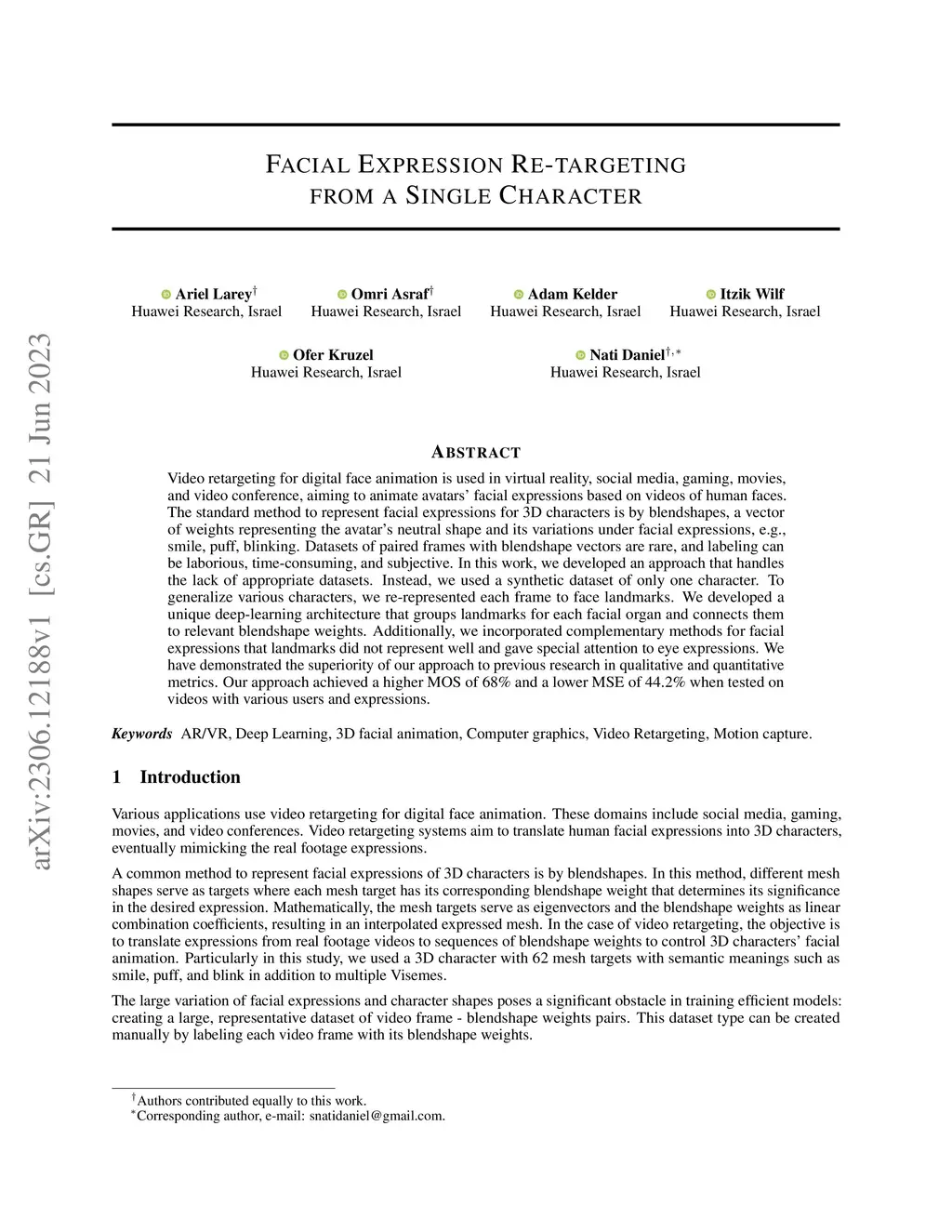 Video retargeting for digital face animation is used in virtual reality, social media, gaming, movies, and video conference, aiming to animate avatars' facial expressions based on videos of human faces. The standard method to represent facial expressions for 3D characters is by blendshapes, a vector of weights representing the avatar's neutral shape and its variations under facial expressions, e.g., smile, puff, blinking. Datasets of paired frames with blendshape vectors are rare, and labeling can be laborious, time-consuming, and subjective. In this work, we developed an approach that handles the lack of appropriate datasets. Instead, we used a synthetic dataset of only one character. To generalize various characters, we re-represented each frame to face landmarks. We developed a unique deep-learning architecture that groups landmarks for each facial organ and connects them to relevant blendshape weights. Additionally, we incorporated complementary methods for facial expressions that landmarks did not represent well and gave special attention to eye expressions. We have demonstrated the superiority of our approach to previous research in qualitative and quantitative metrics. Our approach achieved a higher MOS of 68% and a lower MSE of 44.2% when tested on videos with various users and expressions.