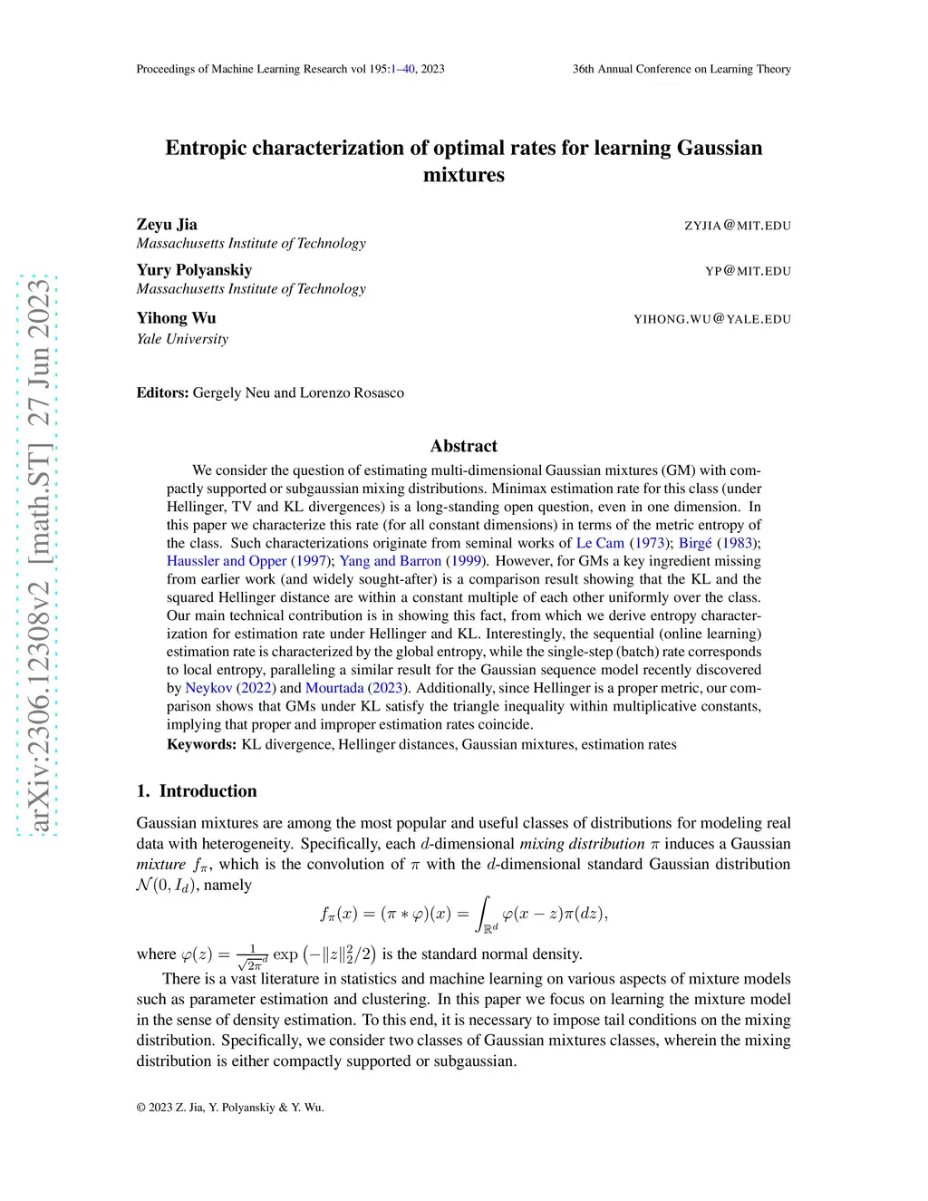 We consider the question of estimating multi-dimensional Gaussian mixtures (GM) with compactly supported or subgaussian mixing distributions. Minimax estimation rate for this class (under Hellinger, TV and KL divergences) is a long-standing open question, even in one dimension. In this paper we characterize this rate (for all constant dimensions) in terms of the metric entropy of the class. Such characterizations originate from seminal works of Le Cam (1973); Birge (1983); Haussler and Opper (1997); Yang and Barron (1999). However, for GMs a key ingredient missing from earlier work (and widely sought-after) is a comparison result showing that the KL and the squared Hellinger distance are within a constant multiple of each other uniformly over the class. Our main technical contribution is in showing this fact, from which we derive entropy characterization for estimation rate under Hellinger and KL. Interestingly, the sequential (online learning) estimation rate is characterized by the global entropy, while the single-step (batch) rate corresponds to local entropy, paralleling a similar result for the Gaussian sequence model recently discovered by Neykov (2022) and Mourtada (2023). Additionally, since Hellinger is a proper metric, our comparison shows that GMs under KL satisfy the triangle inequality within multiplicative constants, implying that proper and improper estimation rates coincide.
