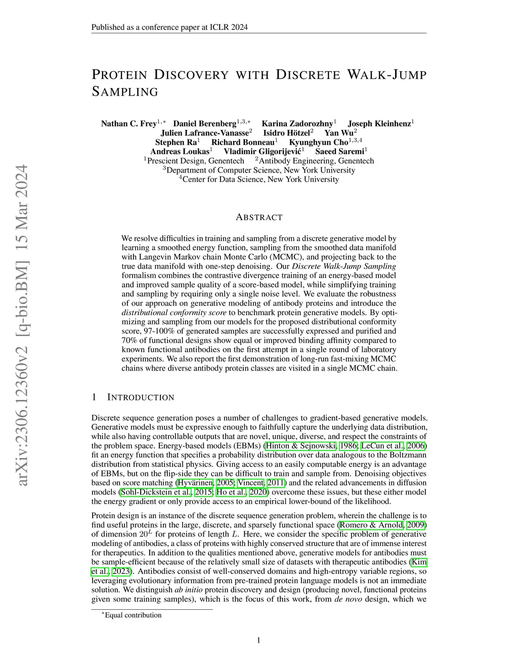 We resolve difficulties in training and sampling from a discrete generative model by learning a smoothed energy function, sampling from the smoothed data manifold with Langevin Markov chain Monte Carlo (MCMC), and projecting back to the true data manifold with one-step denoising. Our Discrete Walk-Jump Sampling formalism combines the contrastive divergence training of an energy-based model and improved sample quality of a score-based model, while simplifying training and sampling by requiring only a single noise level. We evaluate the robustness of our approach on generative modeling of antibody proteins and introduce the distributional conformity score to benchmark protein generative models. By optimizing and sampling from our models for the proposed distributional conformity score, 97-100% of generated samples are successfully expressed and purified and 70% of functional designs show equal or improved binding affinity compared to known functional antibodies on the first attempt in a single round of laboratory experiments. We also report the first demonstration of long-run fast-mixing MCMC chains where diverse antibody protein classes are visited in a single MCMC chain.