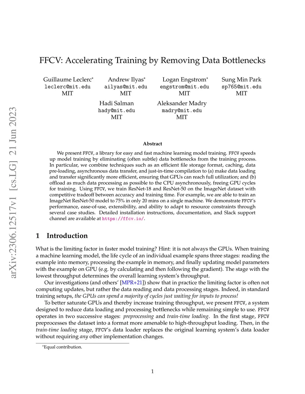 We present FFCV, a library for easy and fast machine learning model training. FFCV speeds up model training by eliminating (often subtle) data bottlenecks from the training process. In particular, we combine techniques such as an efficient file storage format, caching, data pre-loading, asynchronous data transfer, and just-in-time compilation to (a) make data loading and transfer significantly more efficient, ensuring that GPUs can reach full utilization; and (b) offload as much data processing as possible to the CPU asynchronously, freeing GPU cycles for training. Using FFCV, we train ResNet-18 and ResNet-50 on the ImageNet dataset with competitive tradeoff between accuracy and training time. For example, we are able to train an ImageNet ResNet-50 model to 75\% in only 20 mins on a single machine. We demonstrate FFCV's performance, ease-of-use, extensibility, and ability to adapt to resource constraints through several case studies. Detailed installation instructions, documentation, and Slack support channel are available at https://ffcv.io/ .