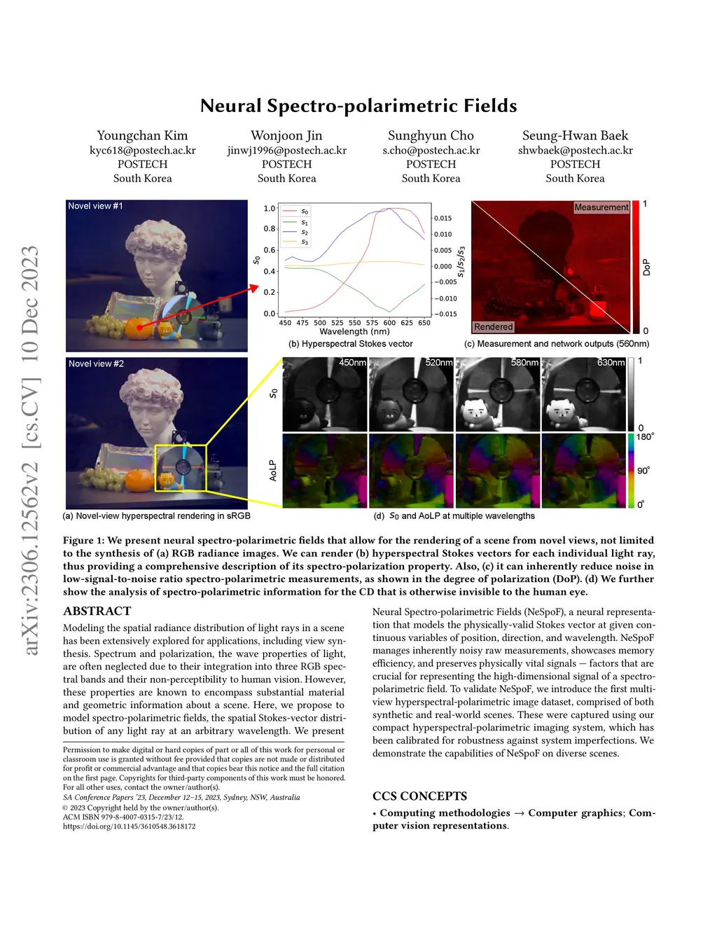 Modeling the spatial radiance distribution of light rays in a scene has been extensively explored for applications, including view synthesis. Spectrum and polarization, the wave properties of light, are often neglected due to their integration into three RGB spectral bands and their non-perceptibility to human vision. However, these properties are known to encompass substantial material and geometric information about a scene. Here, we propose to model spectro-polarimetric fields, the spatial Stokes-vector distribution of any light ray at an arbitrary wavelength. We present Neural Spectro-polarimetric Fields (NeSpoF), a neural representation that models the physically-valid Stokes vector at given continuous variables of position, direction, and wavelength. NeSpoF manages inherently noisy raw measurements, showcases memory efficiency, and preserves physically vital signals - factors that are crucial for representing the high-dimensional signal of a spectro-polarimetric field. To validate NeSpoF, we introduce the first multi-view hyperspectral-polarimetric image dataset, comprised of both synthetic and real-world scenes. These were captured using our compact hyperspectral-polarimetric imaging system, which has been calibrated for robustness against system imperfections. We demonstrate the capabilities of NeSpoF on diverse scenes.
