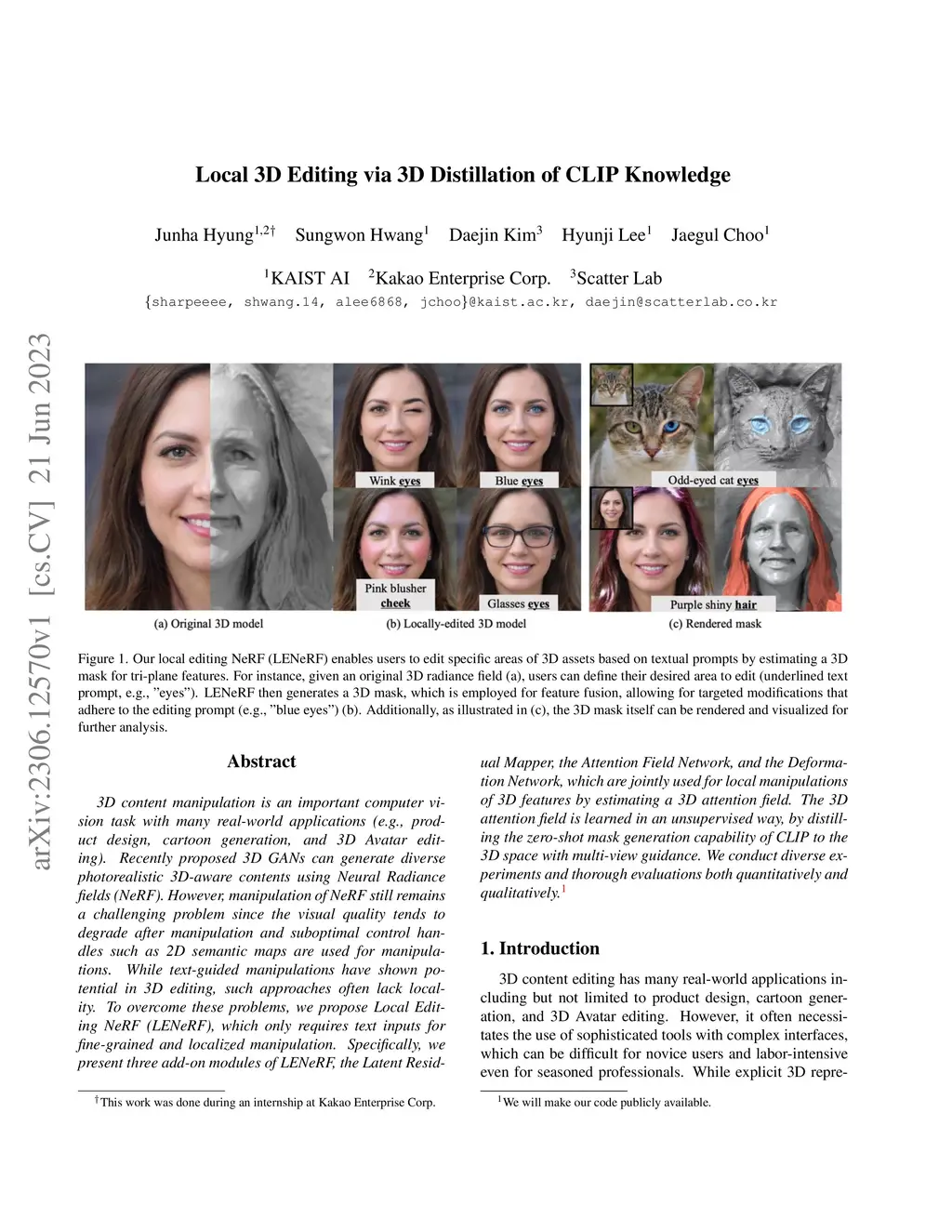 3D content manipulation is an important computer vision task with many real-world applications (e.g., product design, cartoon generation, and 3D Avatar editing). Recently proposed 3D GANs can generate diverse photorealistic 3D-aware contents using Neural Radiance fields (NeRF). However, manipulation of NeRF still remains a challenging problem since the visual quality tends to degrade after manipulation and suboptimal control handles such as 2D semantic maps are used for manipulations. While text-guided manipulations have shown potential in 3D editing, such approaches often lack locality. To overcome these problems, we propose Local Editing NeRF (LENeRF), which only requires text inputs for fine-grained and localized manipulation. Specifically, we present three add-on modules of LENeRF, the Latent Residual Mapper, the Attention Field Network, and the Deformation Network, which are jointly used for local manipulations of 3D features by estimating a 3D attention field. The 3D attention field is learned in an unsupervised way, by distilling the zero-shot mask generation capability of CLIP to the 3D space with multi-view guidance. We conduct diverse experiments and thorough evaluations both quantitatively and qualitatively.