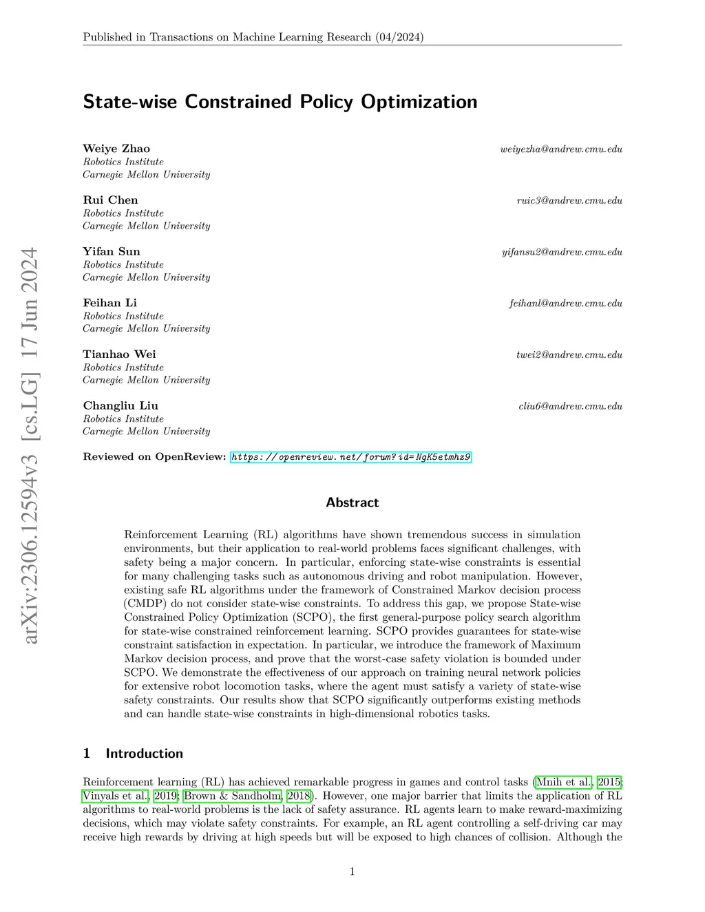 State-wise Constrained Policy Optimization