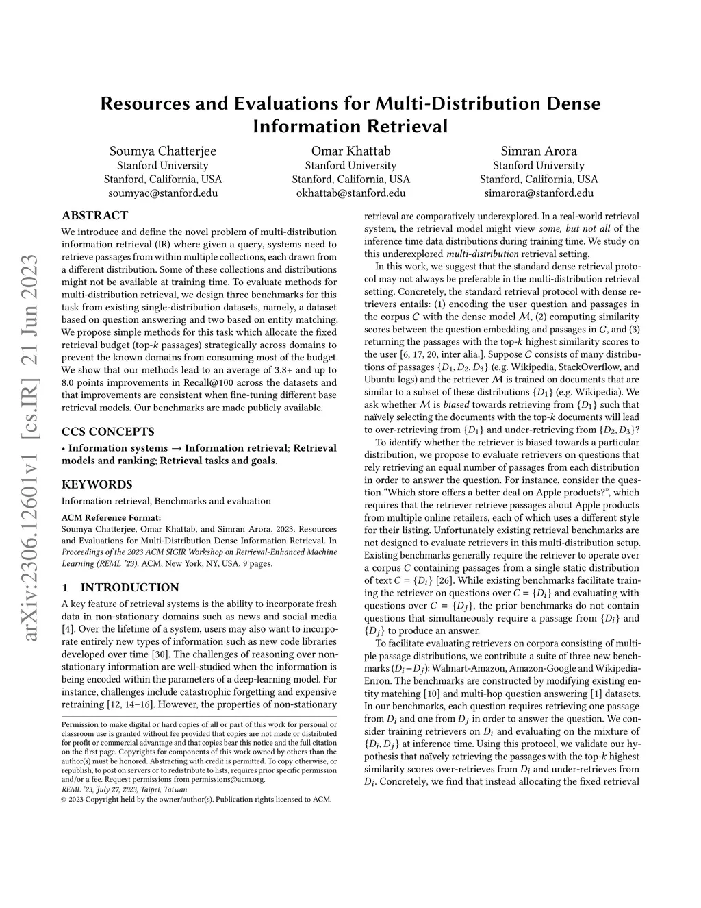We introduce and define the novel problem of multi-distribution information retrieval (IR) where given a query, systems need to retrieve passages from within multiple collections, each drawn from a different distribution. Some of these collections and distributions might not be available at training time. To evaluate methods for multi-distribution retrieval, we design three benchmarks for this task from existing single-distribution datasets, namely, a dataset based on question answering and two based on entity matching. We propose simple methods for this task which allocate the fixed retrieval budget (top-k passages) strategically across domains to prevent the known domains from consuming most of the budget. We show that our methods lead to an average of 3.8+ and up to 8.0 points improvements in Recall@100 across the datasets and that improvements are consistent when fine-tuning different base retrieval models. Our benchmarks are made publicly available.